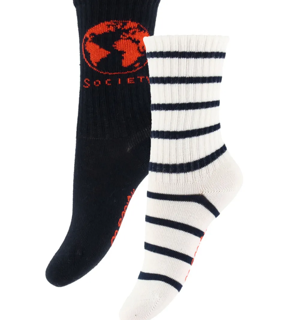 Den ene par er i klassisk hvid med sorte striber, mens det andet par er sort med et print af en jordklode og “Society” i orange. Begge par har en smal elastik øverst, der sikrer en god pasform. Brandets navn er også trykt i orange ved tæerne.