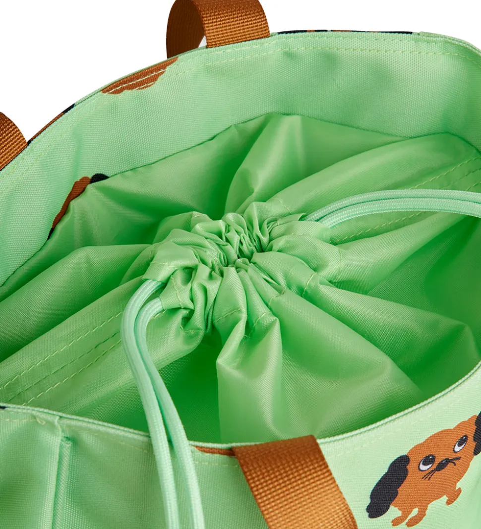 Fin Mini Rodini taske i lysegrøn med et sødt hundeprint i brune nuancer.