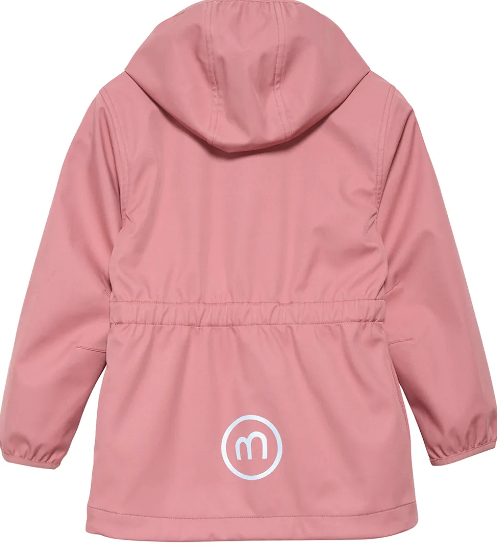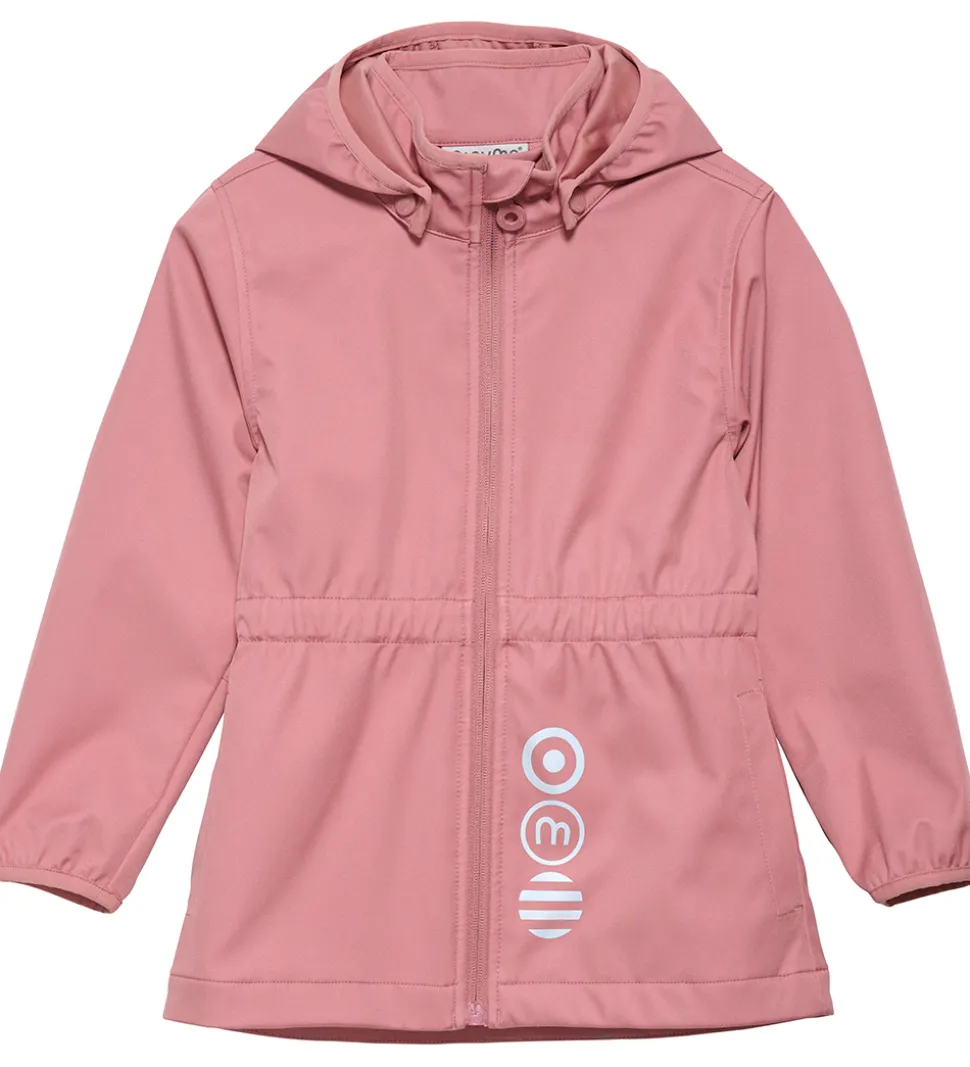 Fin Minymo softshelljakke i rosa med et store refleks-logoprint både fortil og bagtil.