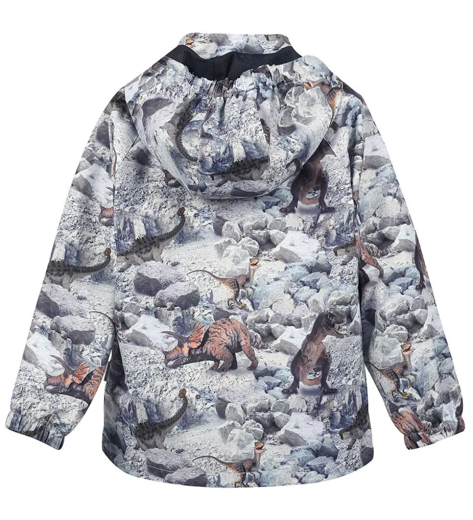 Sej Minymo sommerjakke med et alloverprint af et gråt stenlandskab med dinosaurer.