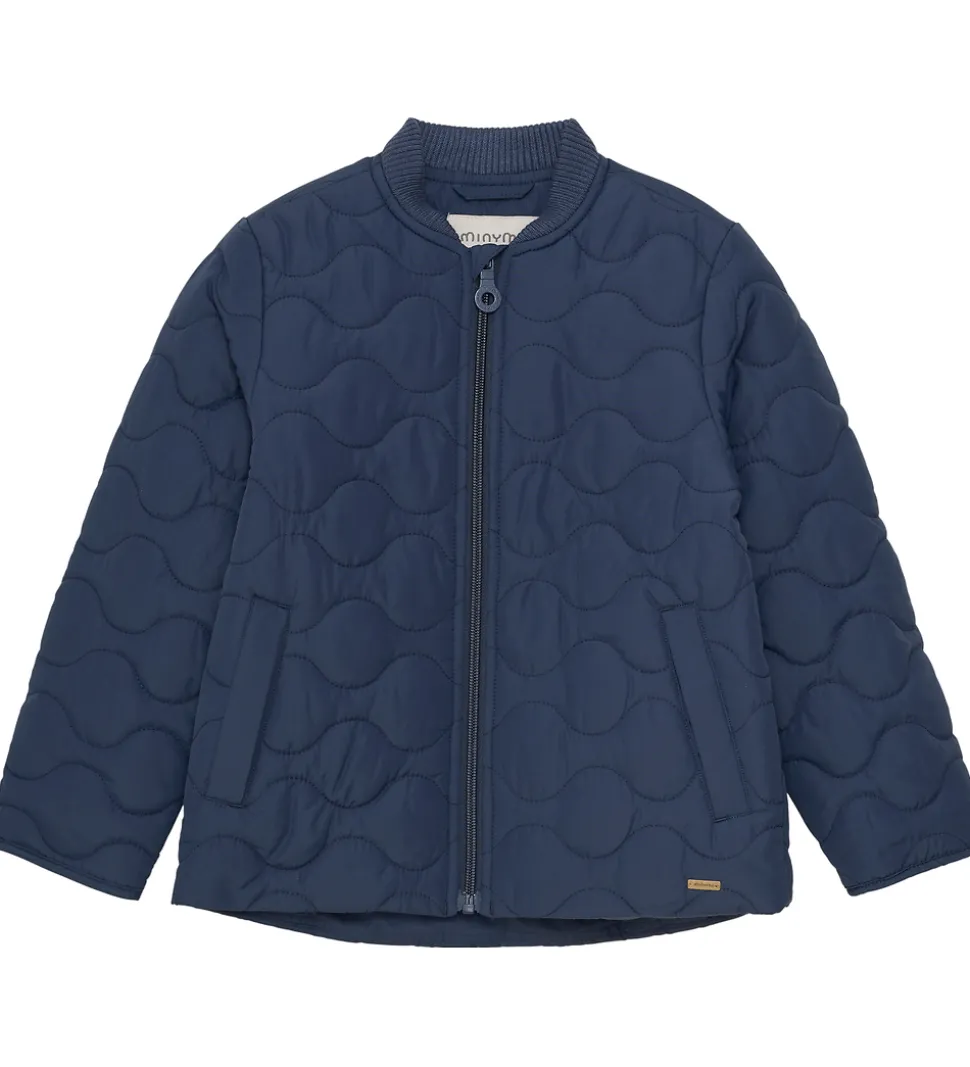 Fin Minymo termojakke i navyblå med en bølgende, quiltet struktur.