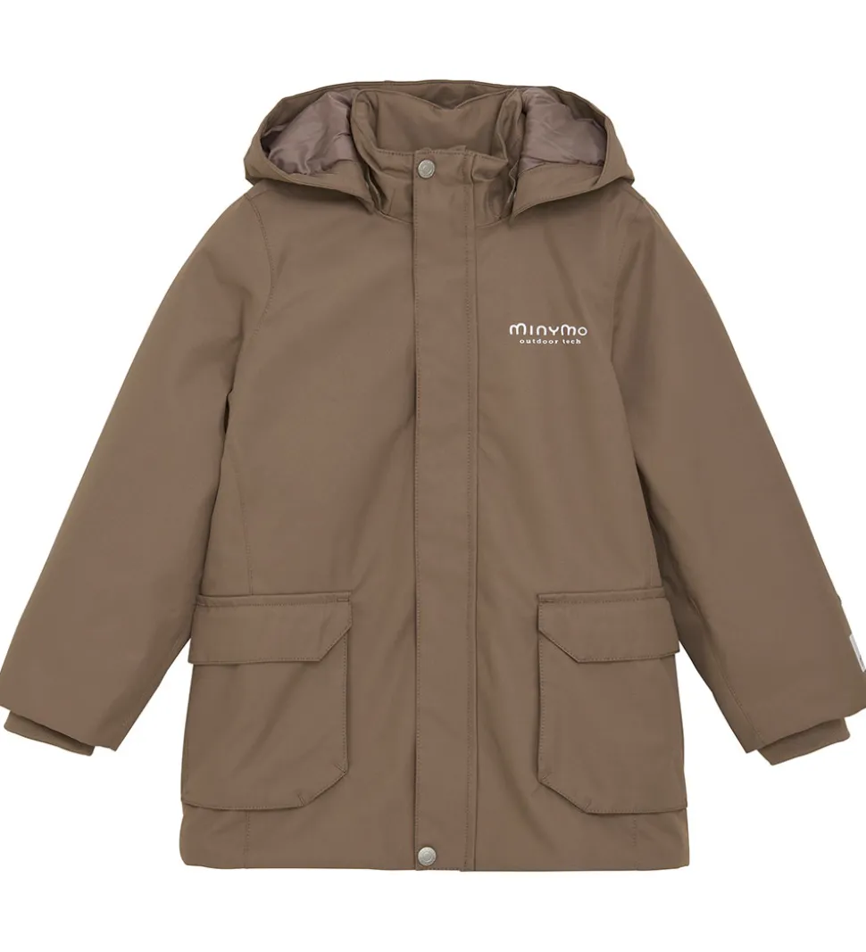 Lækker Minymo vinterjakke i brun med praktiske reflekslogoer.