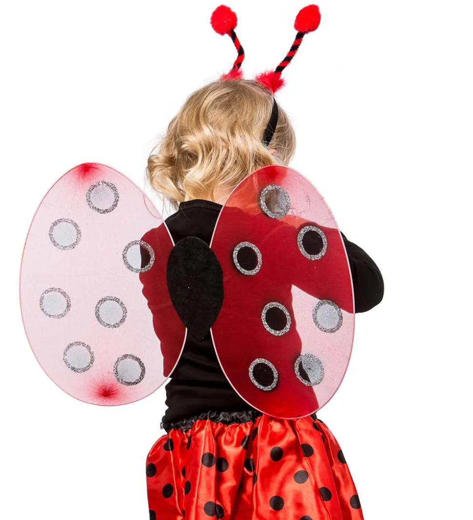 Molly & Rose vingerne er gennemsigtig rød med sorte prikker og sølv glimmer. Vingerne har elastiske stropper, som barnet skal have rundt om skuldrene. Hårbøjlen er sort med følehorn og røde fjer.