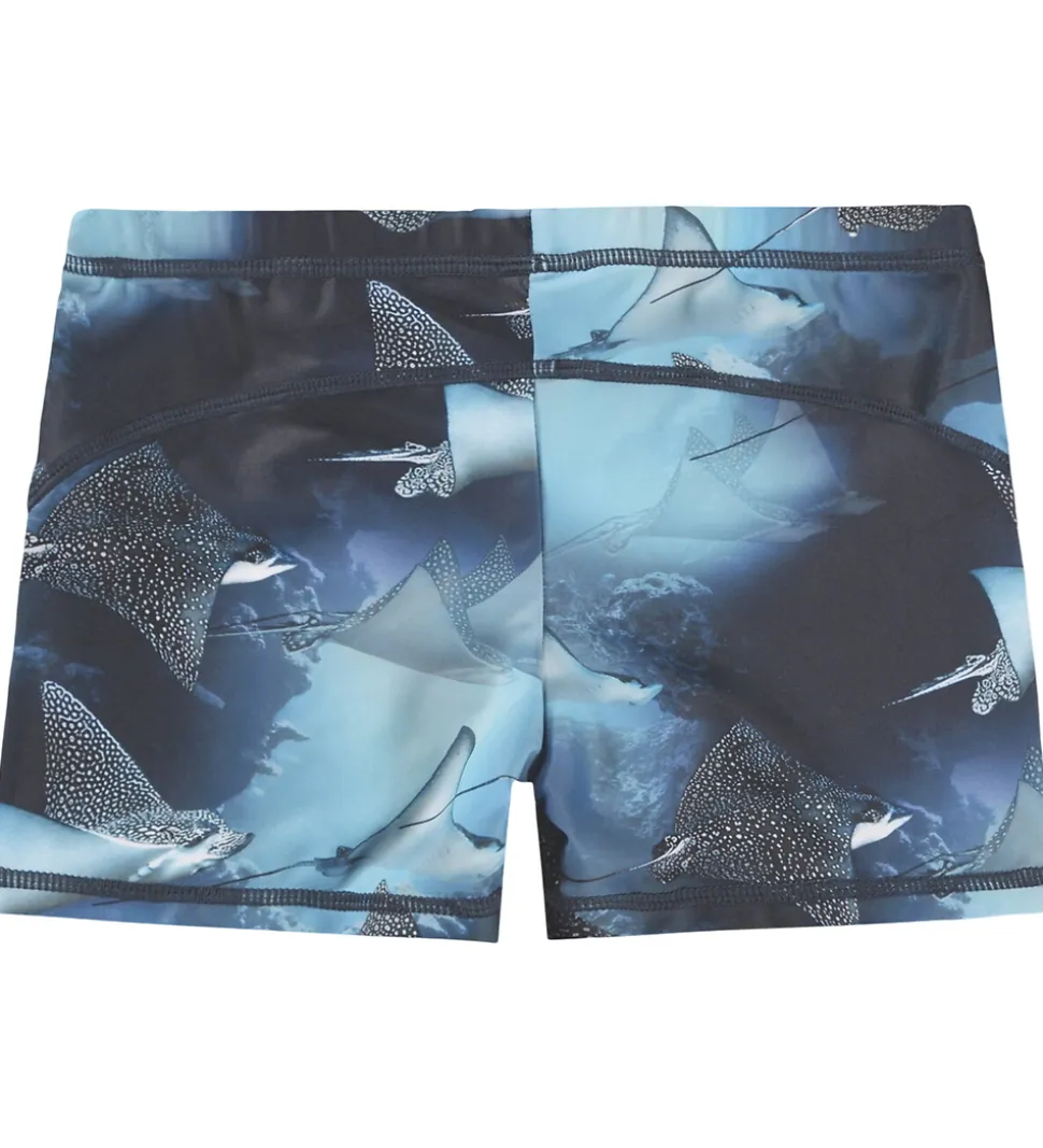 Fine Molo badebukser med et detaljeret havprint i blå nuancer og et sort og gult logo på det ene ben. Molo badebukserne har en bred elastikkant i livet, som kan justeres med snører indvendigt. Badebukserne har et praktisk UV-filter på 50+.