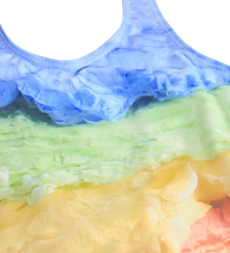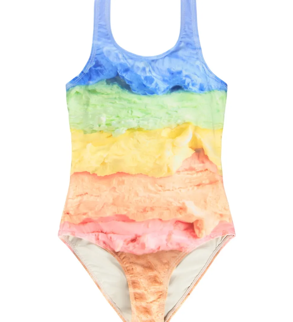 Farverig Molo badedragt med et iøjnefaldende print af flerfarvet is i lag.