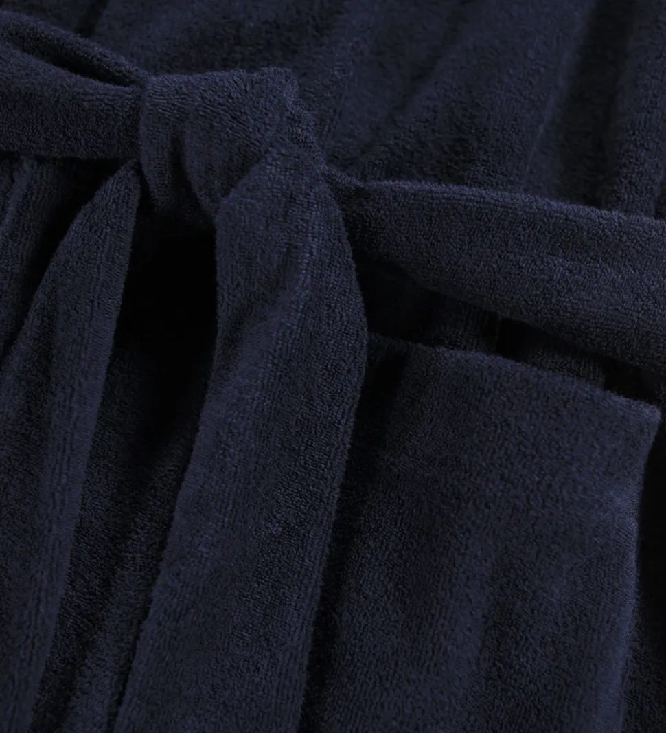 Elegant Molo badekåbe i en dæmpet marineblå farve. Badekåben er lavet i et blødt frottémateriale, som har en ensartet struktur.