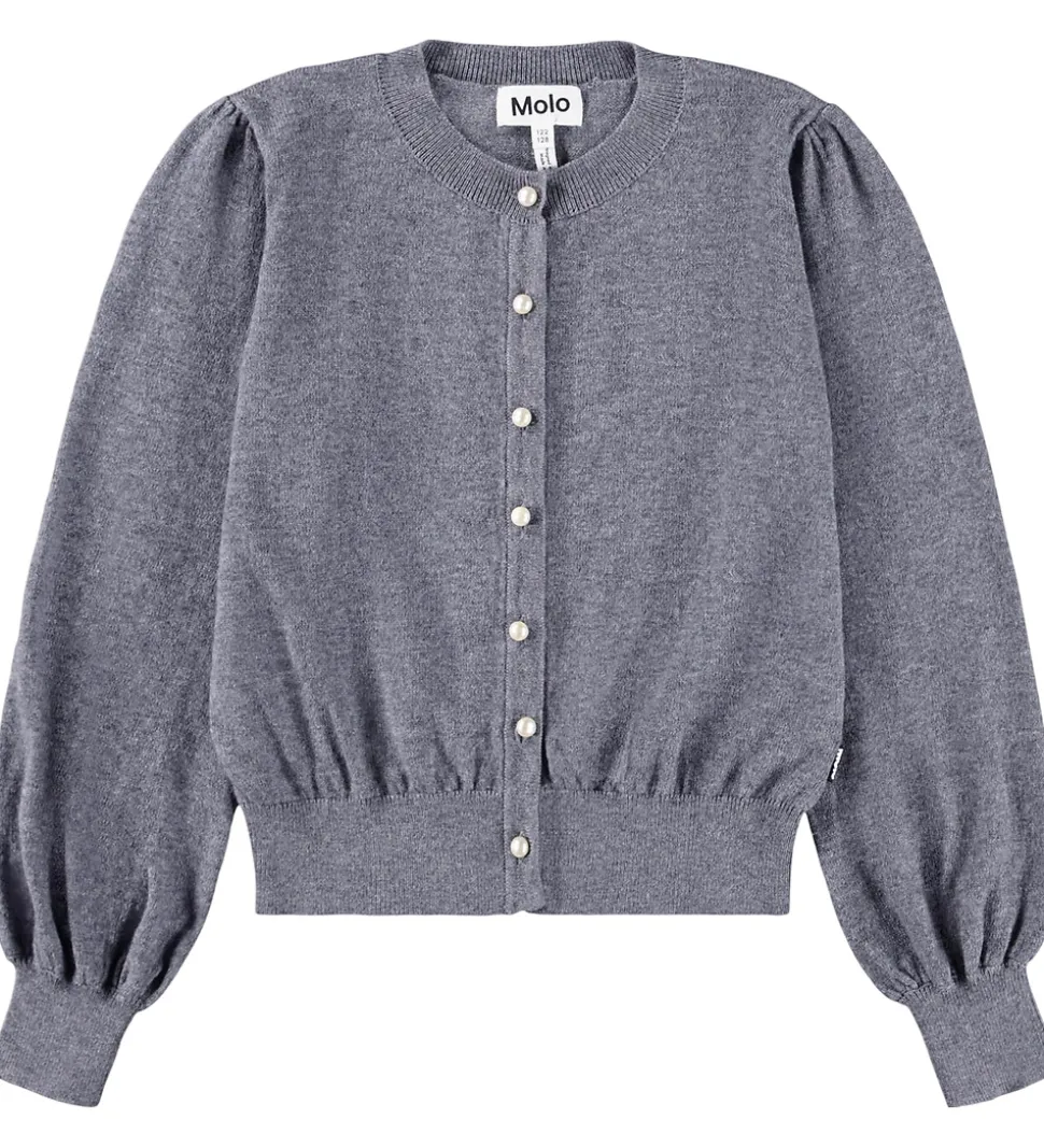 Smuk Molo cardigan i gråmeleret med perlemorsknapper fortil og ved håndleddene. Cardiganen har en rund halsudskæring og lange ballonærmer med puf ved skuldrene. Den har brede ribkanter i alle åbninger, som giver en behagelig pasform. Cardiganen er fremstillet i en blød, strikket kvalitet af uld og bomuld.
