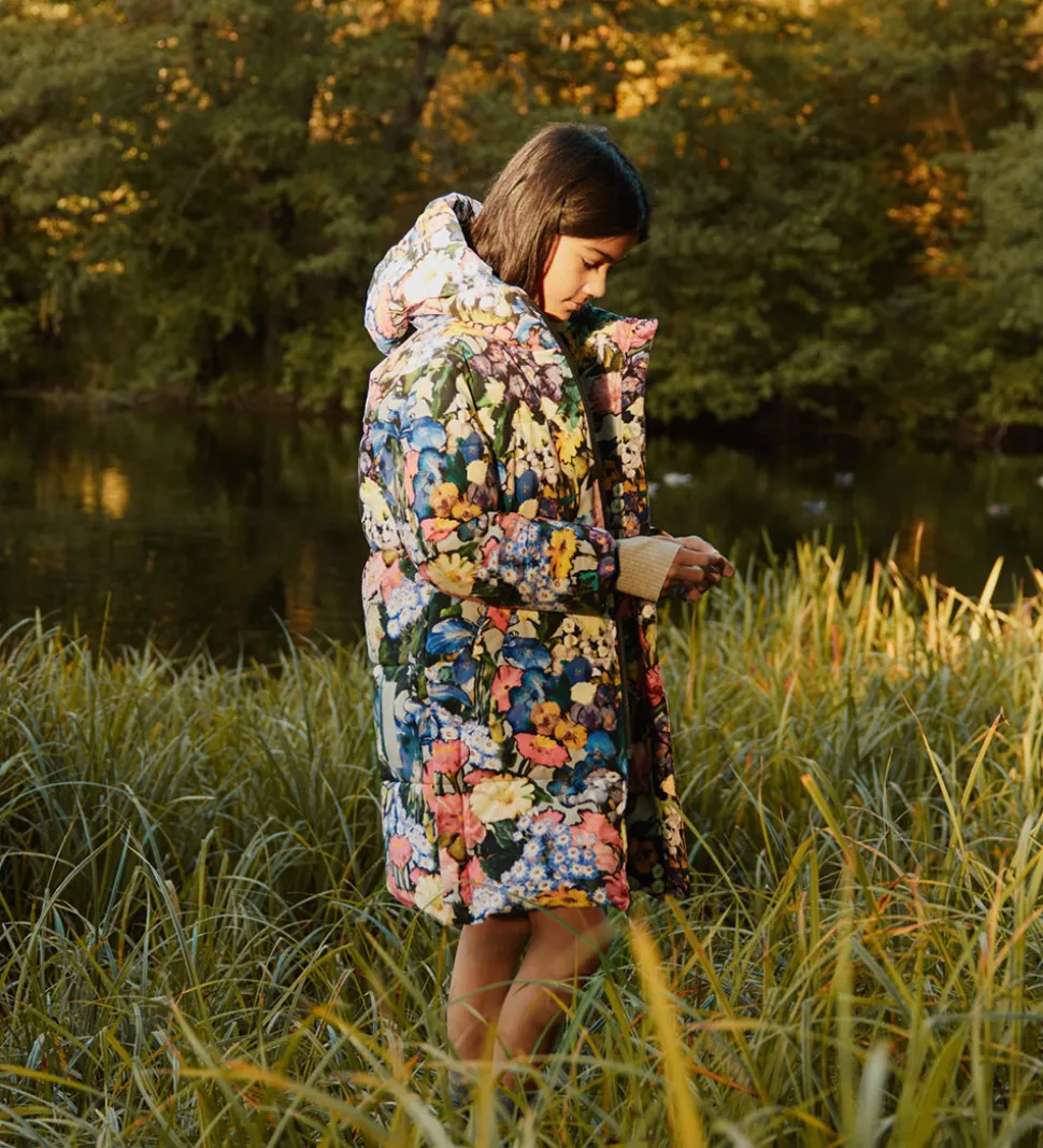 Dejlig Molo dynefrakke med et multifarvet alloverblomsterprint i en malet stil. Dynefrakken har vandrette syninger og en logo-gummiapplikation på venstre bryst.