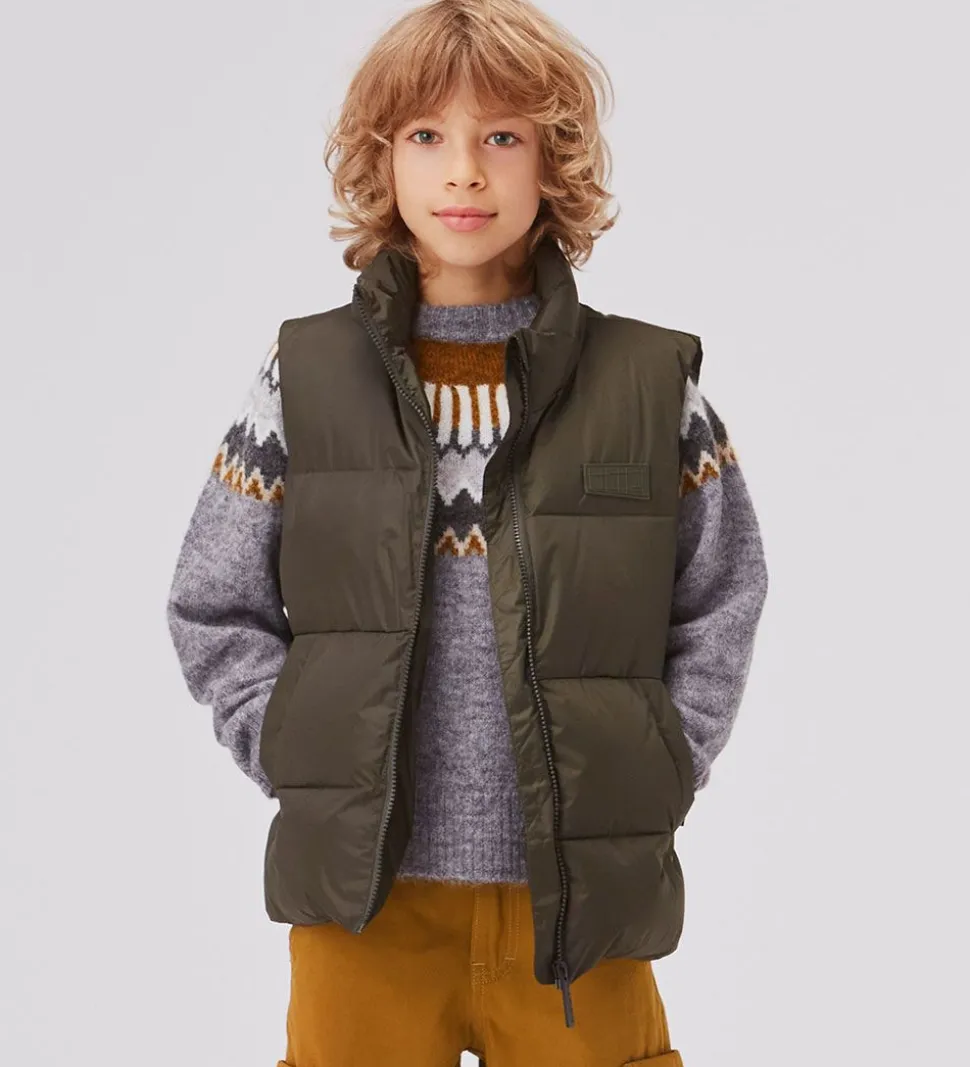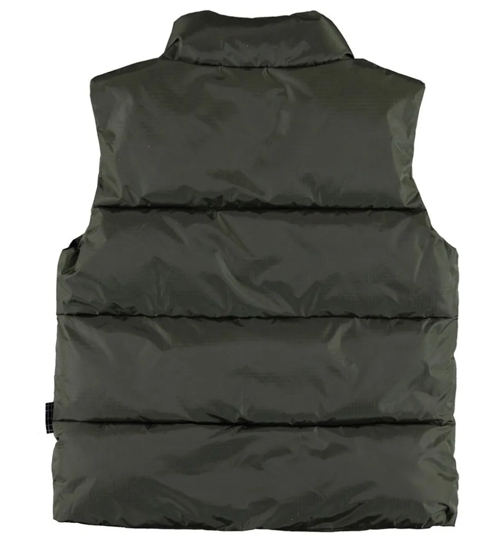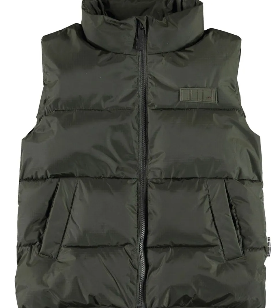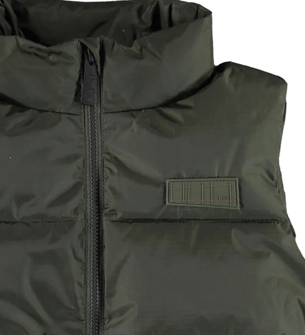 Pæn Molo dynevest i mørkegrøn med en logo-gummiapplikation på venstre bryst. Dynevesten har klassiske, vandrette syninger.