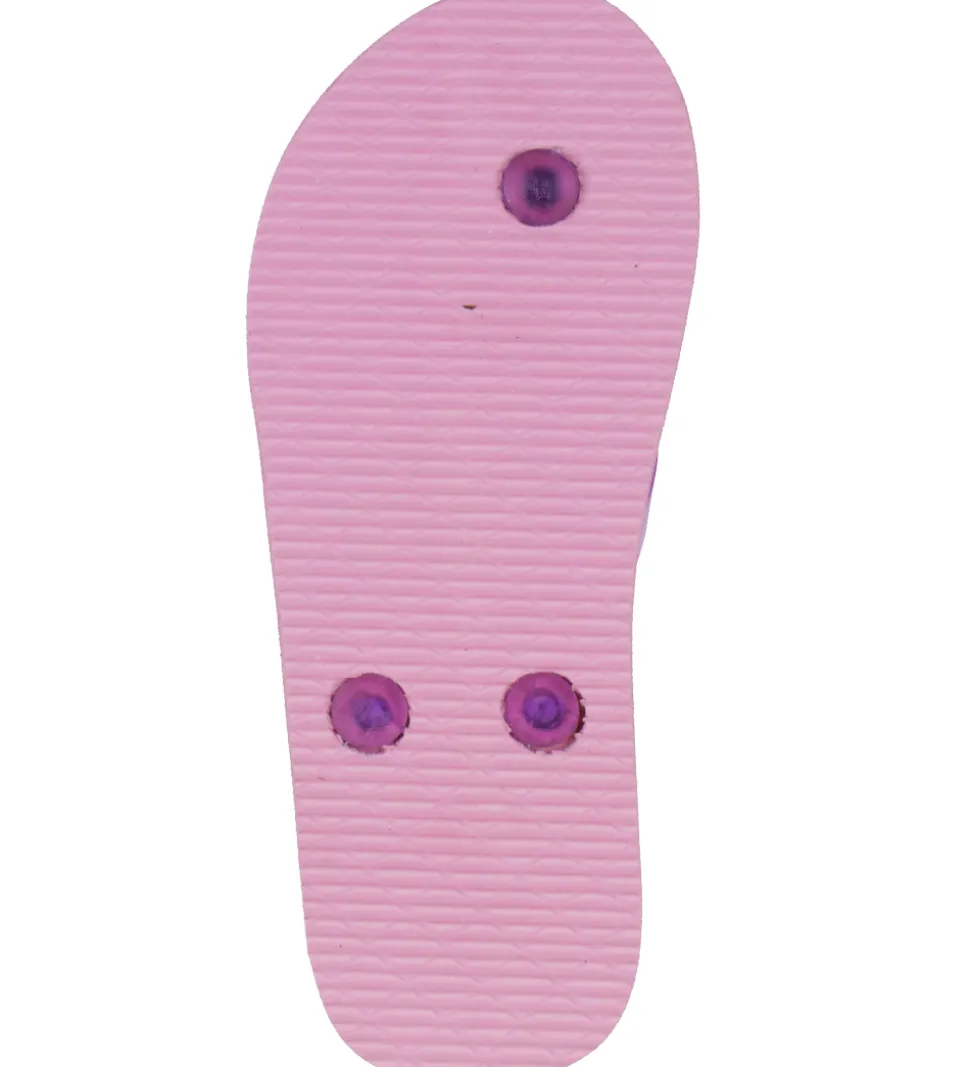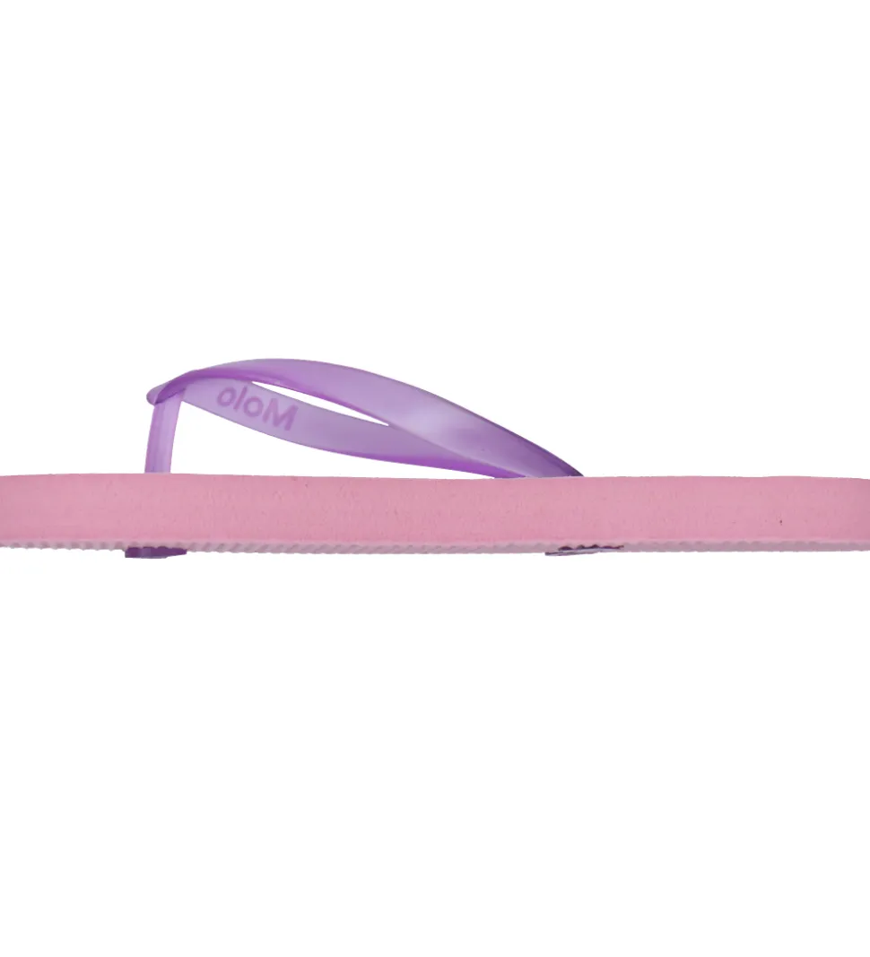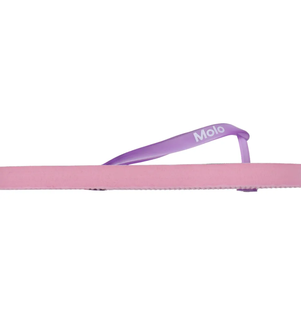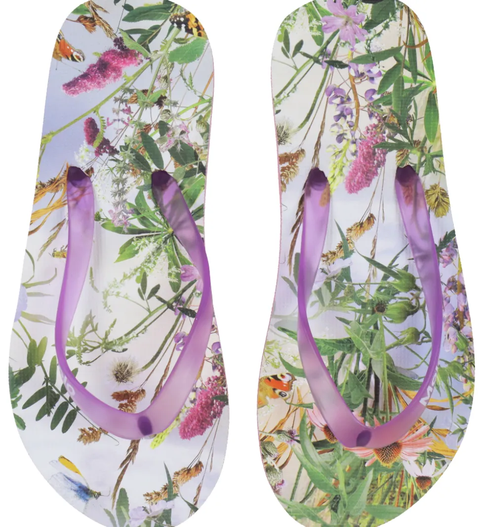 Fine Molo klipklapper med blomsterprint i rosa, lilla, blå og grønne nuancer. Klipklapperne har lilla remme.