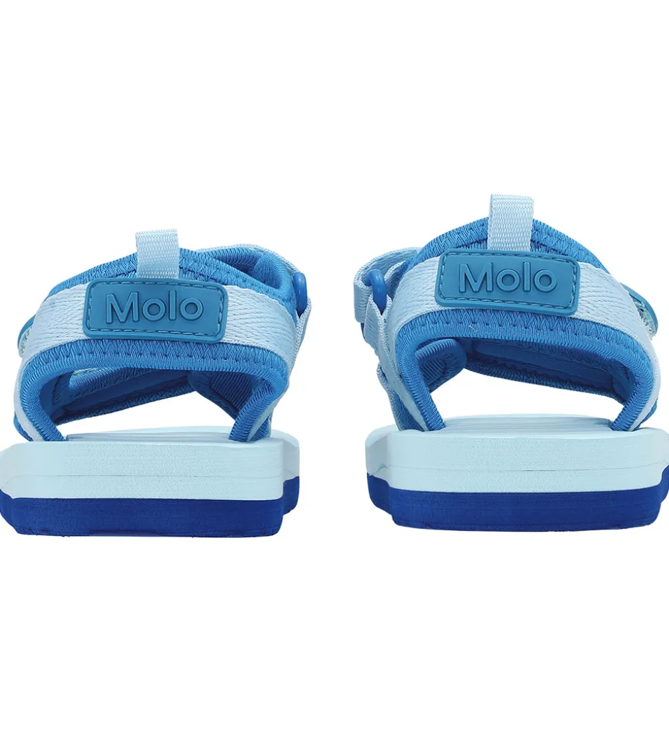 Smarte Molo sandaler i tre blå nuancer. Molo sandalerne er en åben model med en rem bag hælen og to justerbare velcroremme over vristen. Sandalerne har en overdel af blødt, glatvævet tekstil, og sålerne er lavet af letvægtigt EVA.