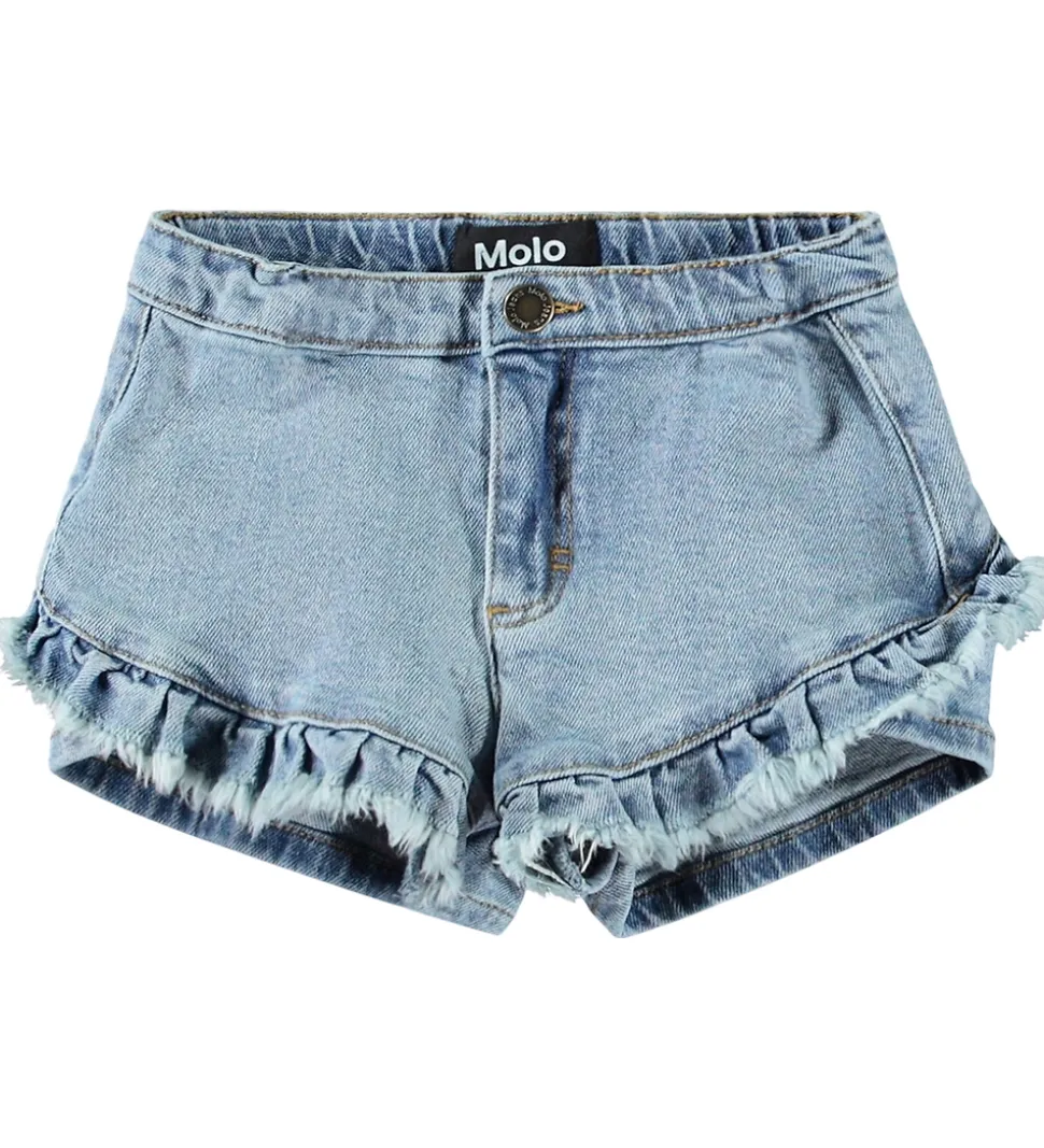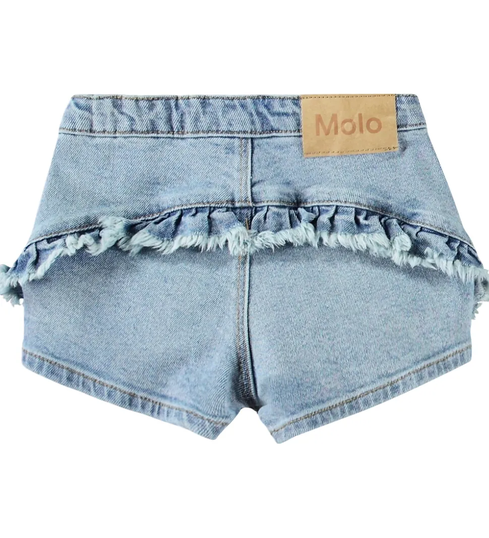 Smarte Molo shorts i blåt denim i en strækbar kvalitet. Molo shortsene er en helt kort model med dekorative flæser både fortil og bagpå. I livet har de en justerbar elastikkant, og de åbnes med en trykknap og en lynlås.