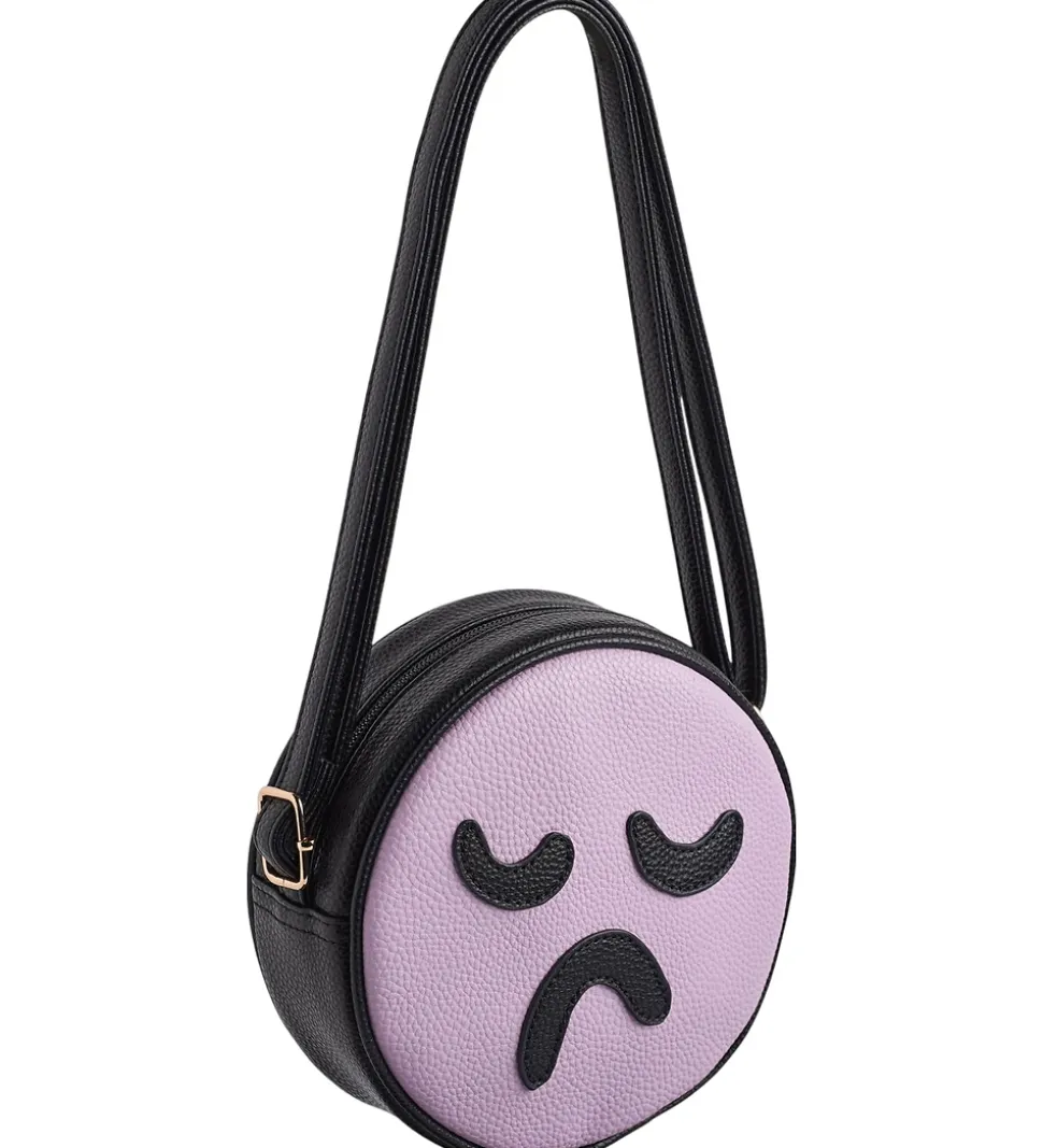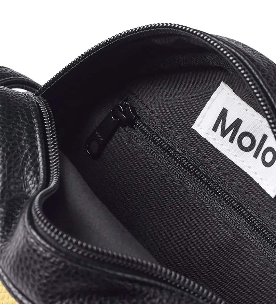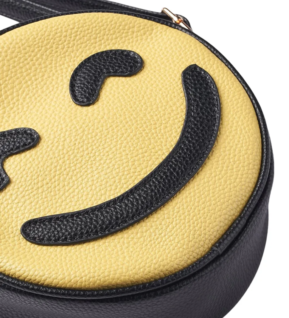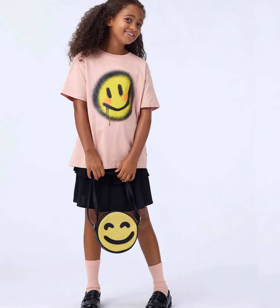 Stilfuld Molo skuldertaske i sort med et iøjnefaldende, gult smiley-print på fronten og et lilla smiley-print på bagsiden. Molo tasken har en praktisk, justerbar skulderrem og rund form, der gør den både funktionel og trendy.