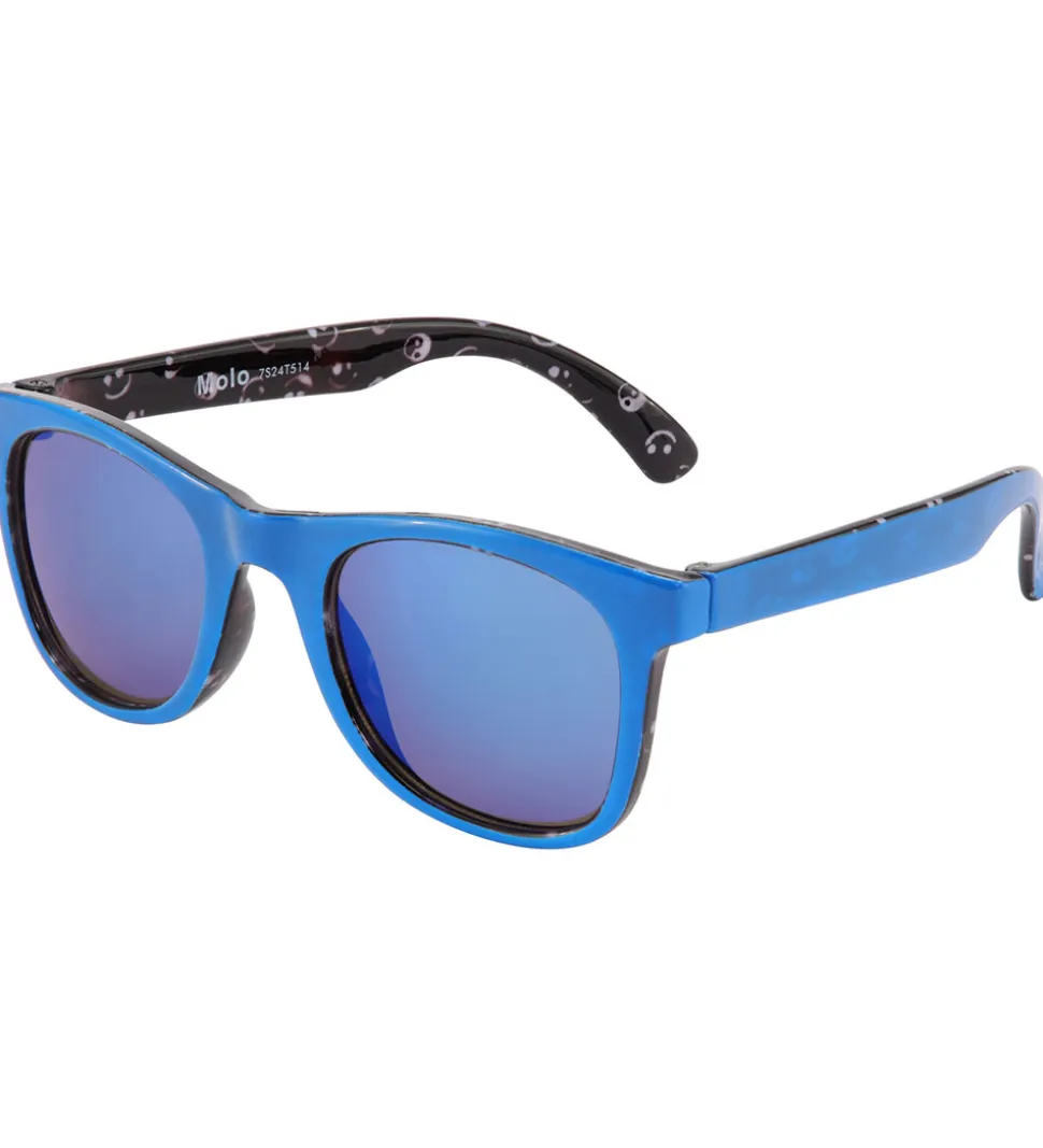 Skønne Molo solbriller i blå på ydersiden, mens indersiden af stængerne er sort med der print af små smileyer og yin og yang-symboler. Brilleglassene er i en blå tone.