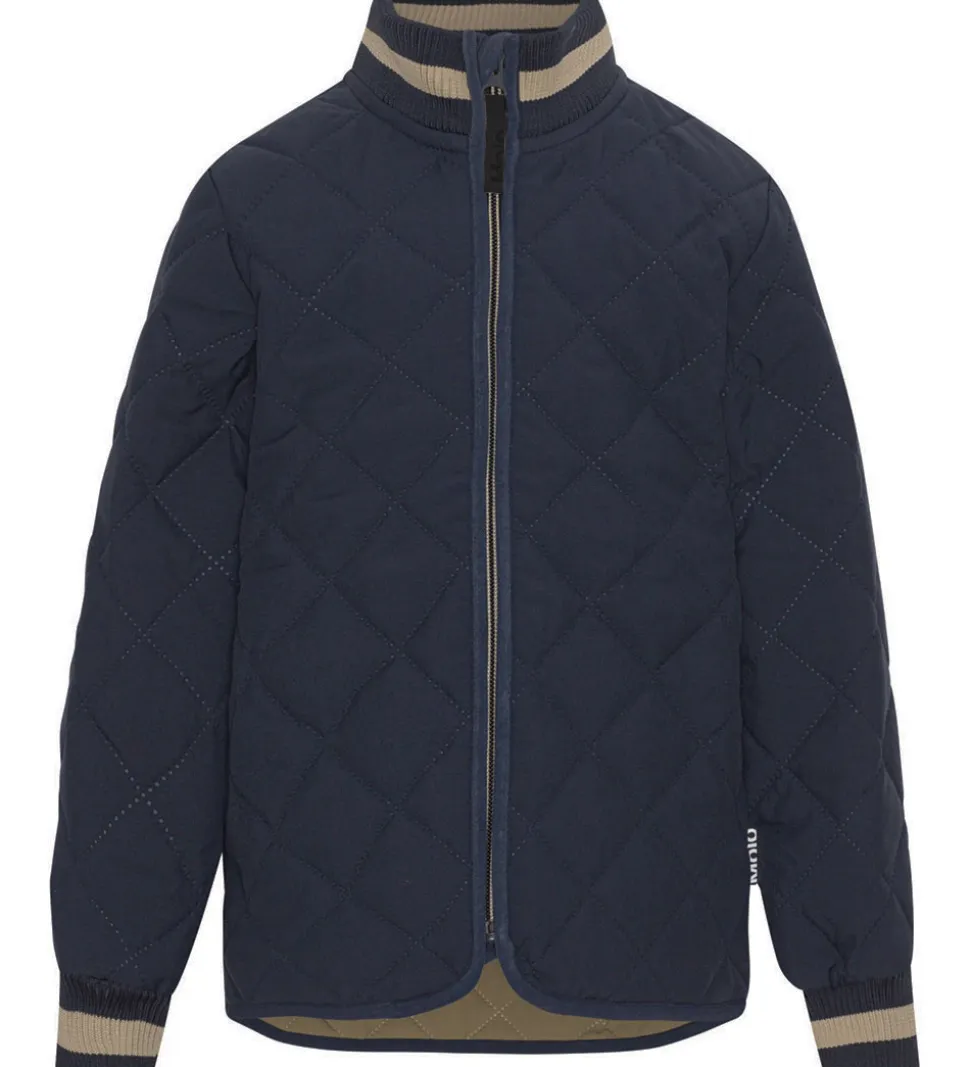 Dejlig Molo termojakke i navyblå med et quiltet mønster og med hvide striber på ribkanterne. Indvendigt er der et avokadogrønt for.