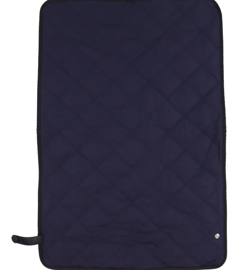 Der medfølger et praktisk pusleunderlag. På den ene side er det navy med et quiltet mønster og i samme materiale som tasken, mens det på den anden side er lavet af hvidr frotté. Pusleunderlaget er let vatteret, og det kan foldes sammen og holdes på plads med en rem med en trykknap.