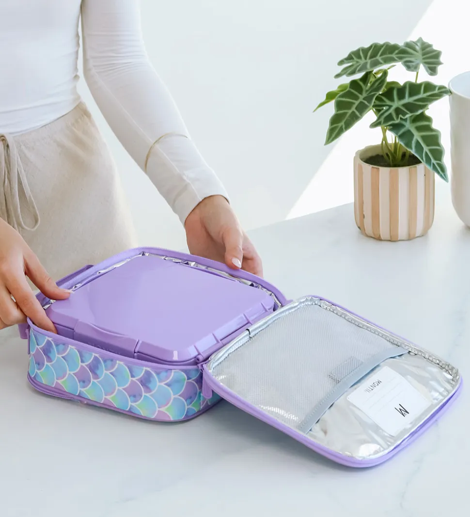Lækker MontiiCo køletaske med print af havfrueskæl i lilla, blå og grønne farver.