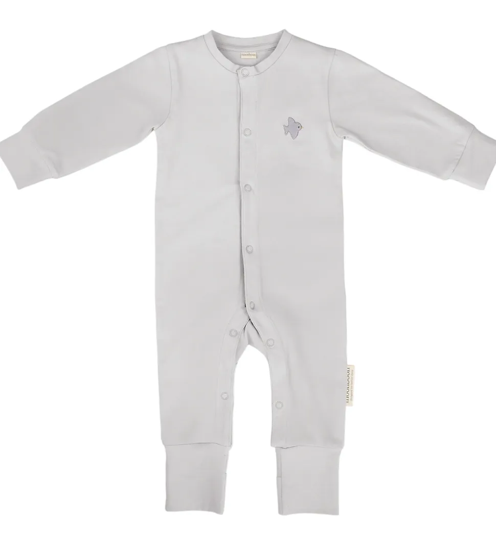 Dejlig Moonboon natdragt med babyhjelm i gråbeige med en broderet fugl. Moonboon natdragten med babyhjelm leveres i en fin gaveæske.