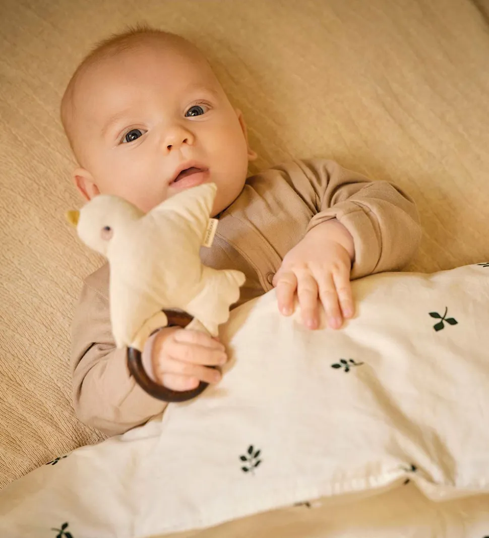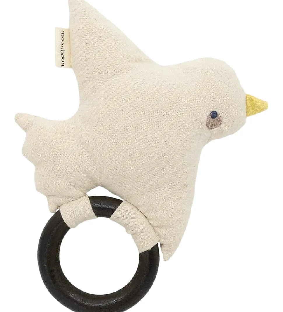 Moonboon ranglen inkluderer en træring, som gør den nem for små hænder at holde om. Når ranglen rystes, laver den en let raslelyd, der tiltrækker barnets opmærksomhed. Derudover har den en praktisk velcrostrop, som gør den let at hænge på barnevognens kaleche eller andre steder.