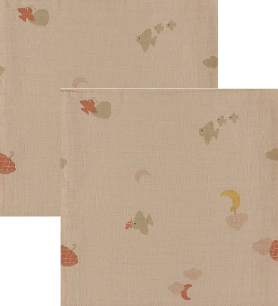 Lækre Moonboon stofbleer solgt i en 2-pak i lyserosa med print af dyr, skyer og paraplyer. De er fremstillet i blødt økologisk bomuld med musselin-struktur. Stofbleerne er alsidig og kan bruges i mange forskellige situationer, hvilket gør dem til et praktisk valg i hverdagen.