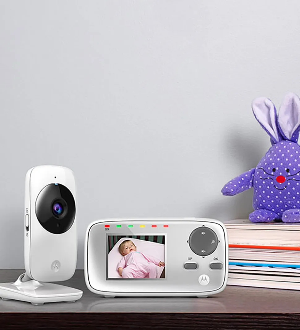 Smart Motorola babymonitor, der består af et kamera og en videoskærm i et hvidt farvetema.