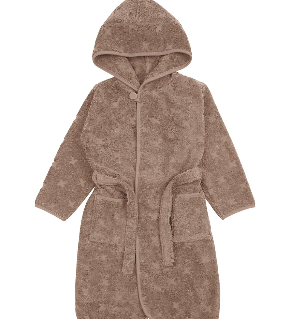 Flot Müsli badekåbe i en varm, lysebrun nuance med et subtilt mønster af stjerner. Den har en blød frottéstruktur, som giver en behagelig følelse.