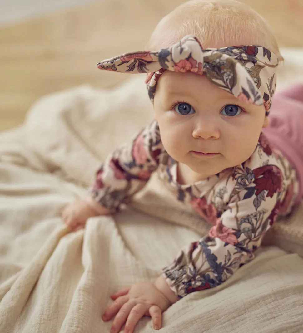 Elegant Müsli hårbånd i pudderrosa med et blomstret print i rosa og lilla nuancer. Müsli hårbåndet er tænkt som en skøn detalje til enhver garderobe.