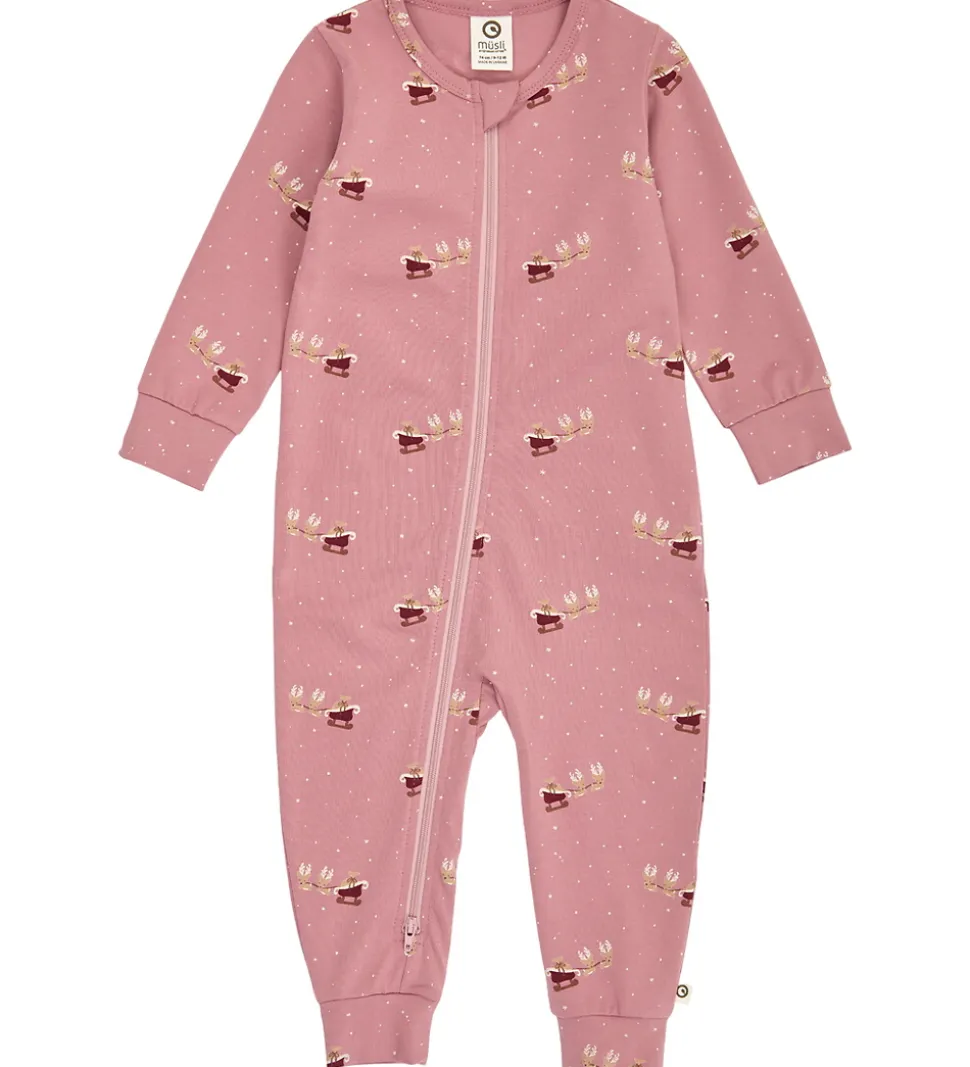 Charmerende Müsli heldragt i rosa med et delikat juleprint af rensdyr og kane.