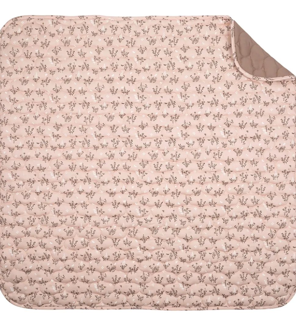 Flot Müsli tæppe i rosa med quiltet struktur og blomsterprint i brun og hvid. På den anden side er tæppet ensfarvet brunt.