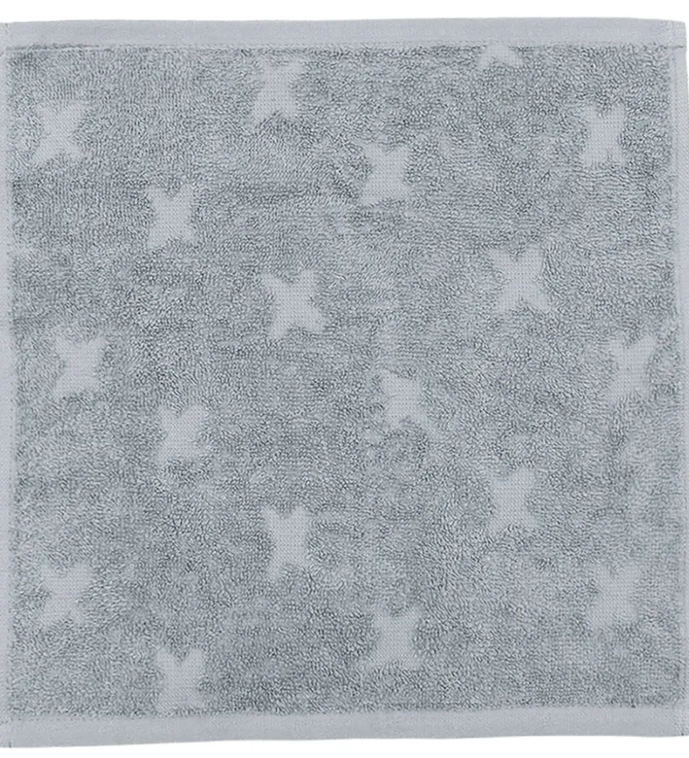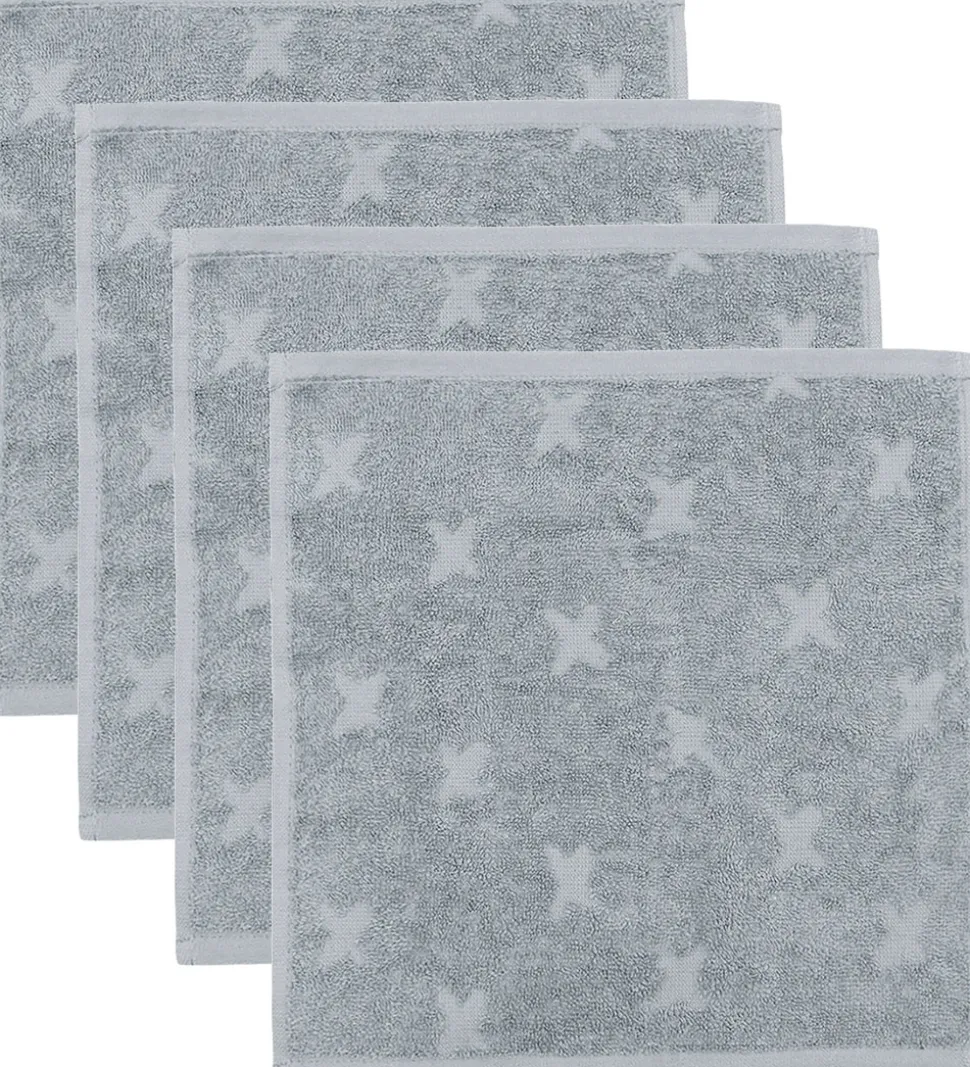 Fine Müsli vaskeklude solgt i en 4-pak i lysegrå med et mønster af små, indprægede stjerner. Müsli vaskekludene har en kvadratisk form, og de er lavet af blødt frotté.
