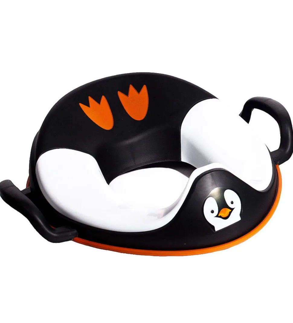 Praktisk My Carry Potty toilettræner i et sjovt pingvin-print med sorte, hvide og orange farver.