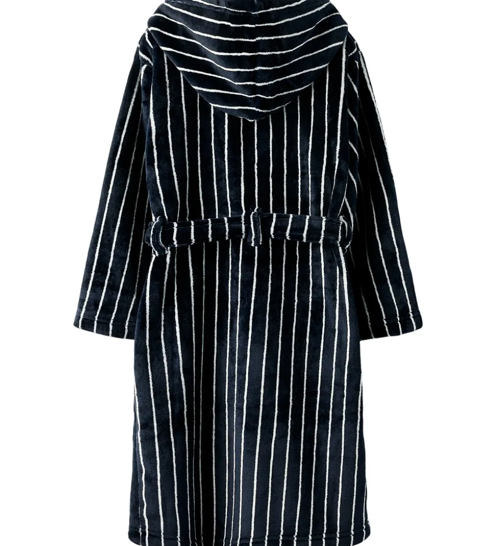 Elegant Name It badekåbe med vandrette striber i navy og hvid. Den har en blød, plysset struktur, som giver et behageligt udseende.