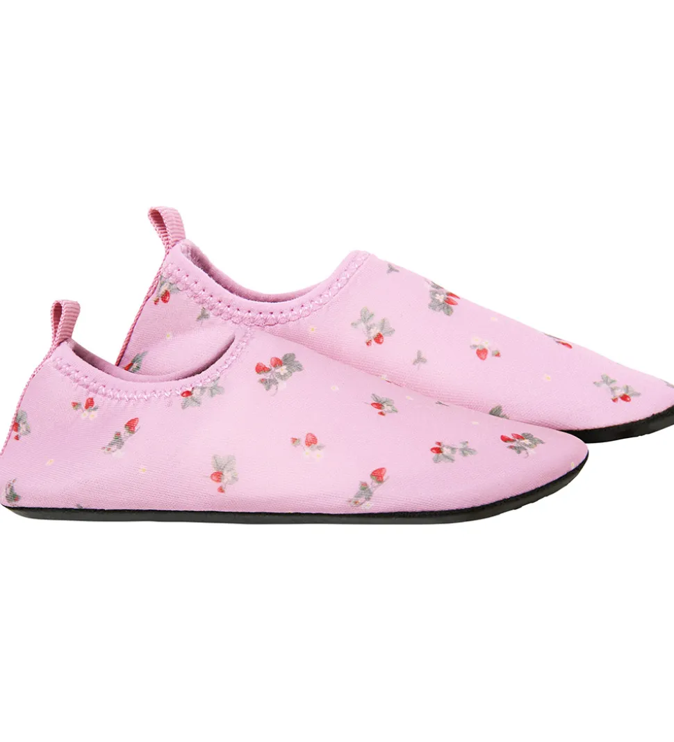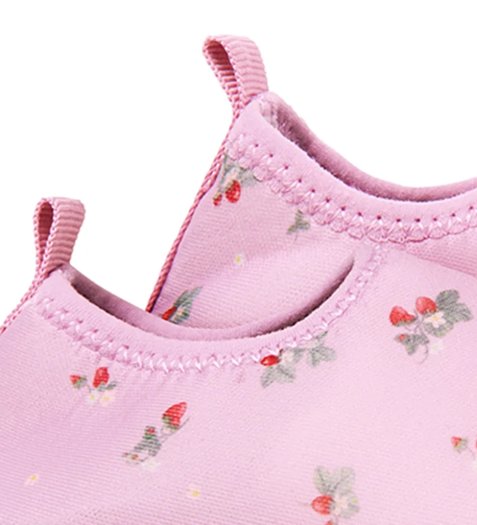 Name It badeskoene er lavet i et blødt og strækbart materiale med udtagelige indersåler. Bagtil er der en lille strop, som er behjælpelig når man skal have badeskoene på. Badeskoene har en god ydersål i sort med et praktisk mønster under bunden, som sikrer et godt fodfæste.