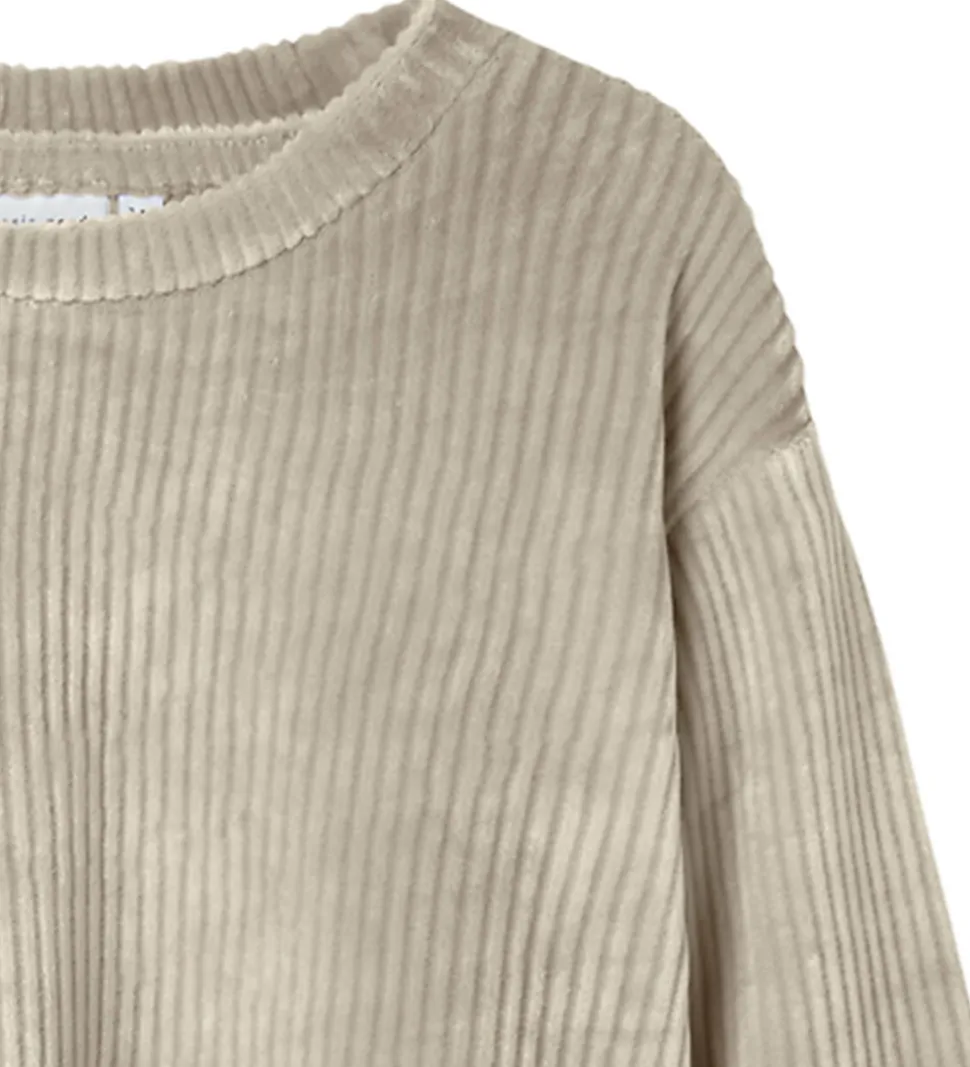 Blød Name It bluse i beige fløjlsvelour. Blusen har lange ærmer og en rund halsudskæring med brede kanter i ærme- og taljeåbning.