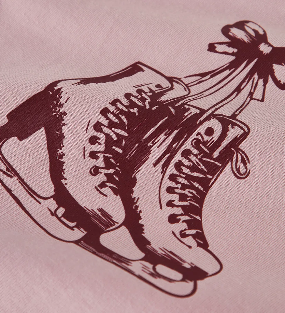 Flot Name It bluse i rosa med print af skøjter i bordeauxrød på fronten. Blusen har en rund halsudskæring med en smal ribkant og lange ærmer.
