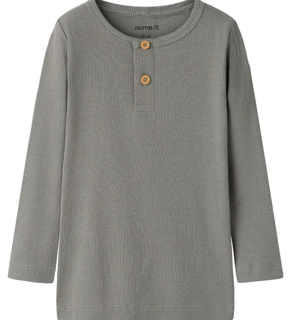Flot Name It bluse i støvet grøn med ribstruktur. Blusen har to knapper fortil og lange ærmer.