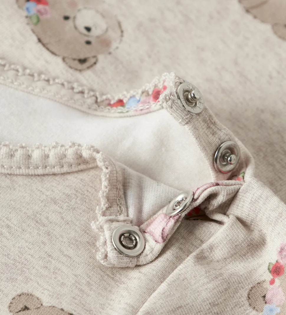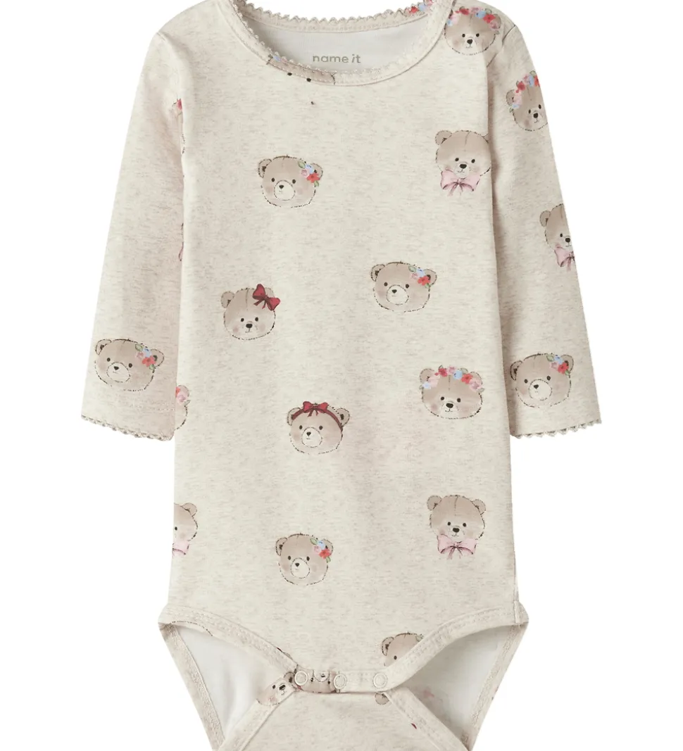 Fin Name It body i meleret beige med et alloverprint af søde bamser. Bodyen har en rund halsudskæring med trykknapper ved venstre skulder og lange ærmer. I hals- og ærmeåbninger er der fine, bølgede kanter. Den lukkes mellem benene med trykknapper.