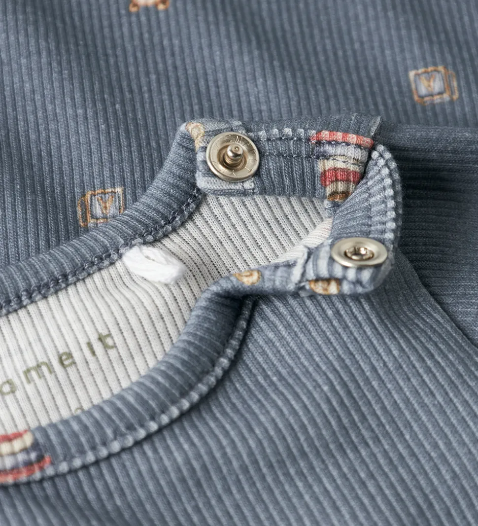 Smart Name It body i blå med et alloverprint af forskelligt legetøj. Bodyen har en rund halsudskæring med en trykknap ved venstre skulder og lange ærmer. Den lukkes mellem benene med trykknapper.