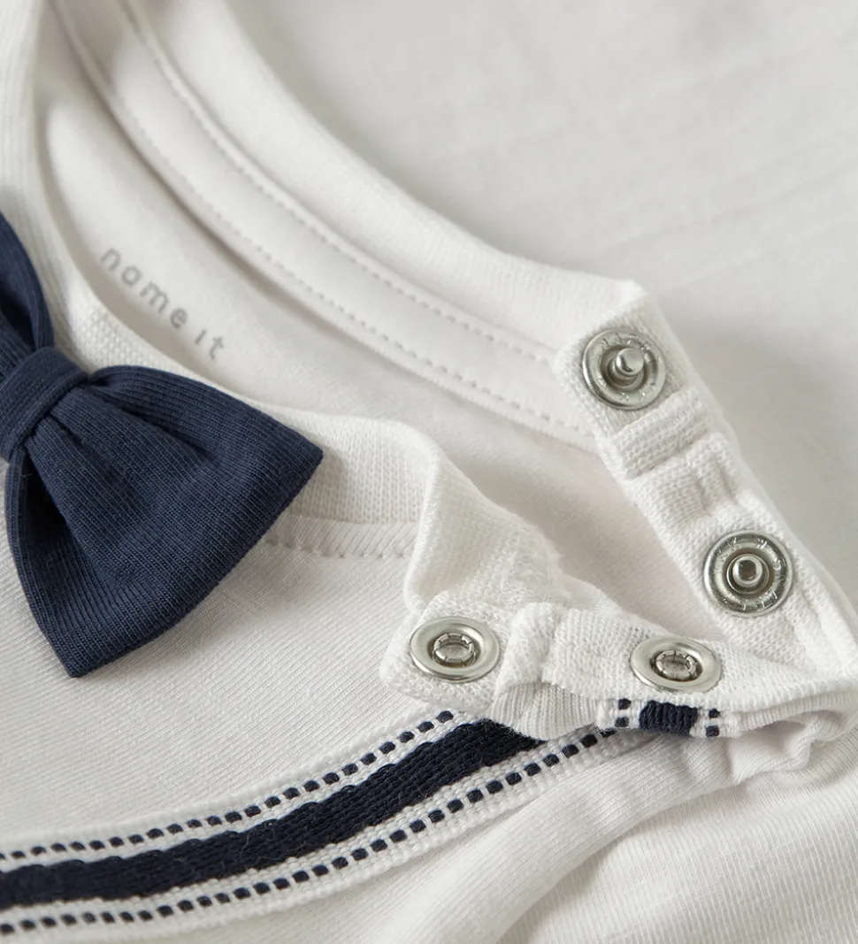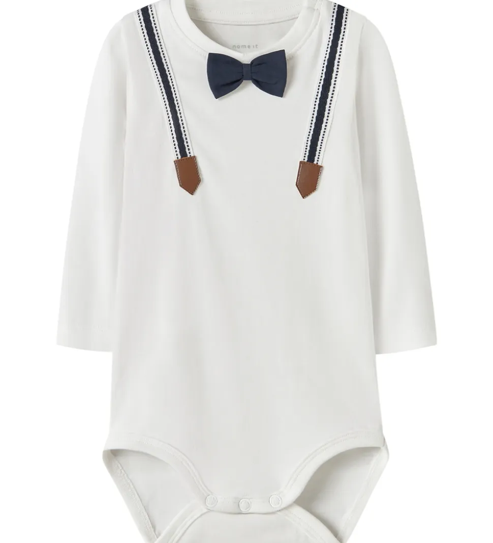 Elegant Name It body med lange ærmer i en klassisk hvid farve. Bodyen har unikke detaljer som en påsyet mørkeblå butterfly og brune selestropper, der giver et stilfuldt udtryk. Name It har sørget for, at bodyen har en fin rund halsudskæring og praktiske trykknapper i bunden, som gør den let at få af og på.