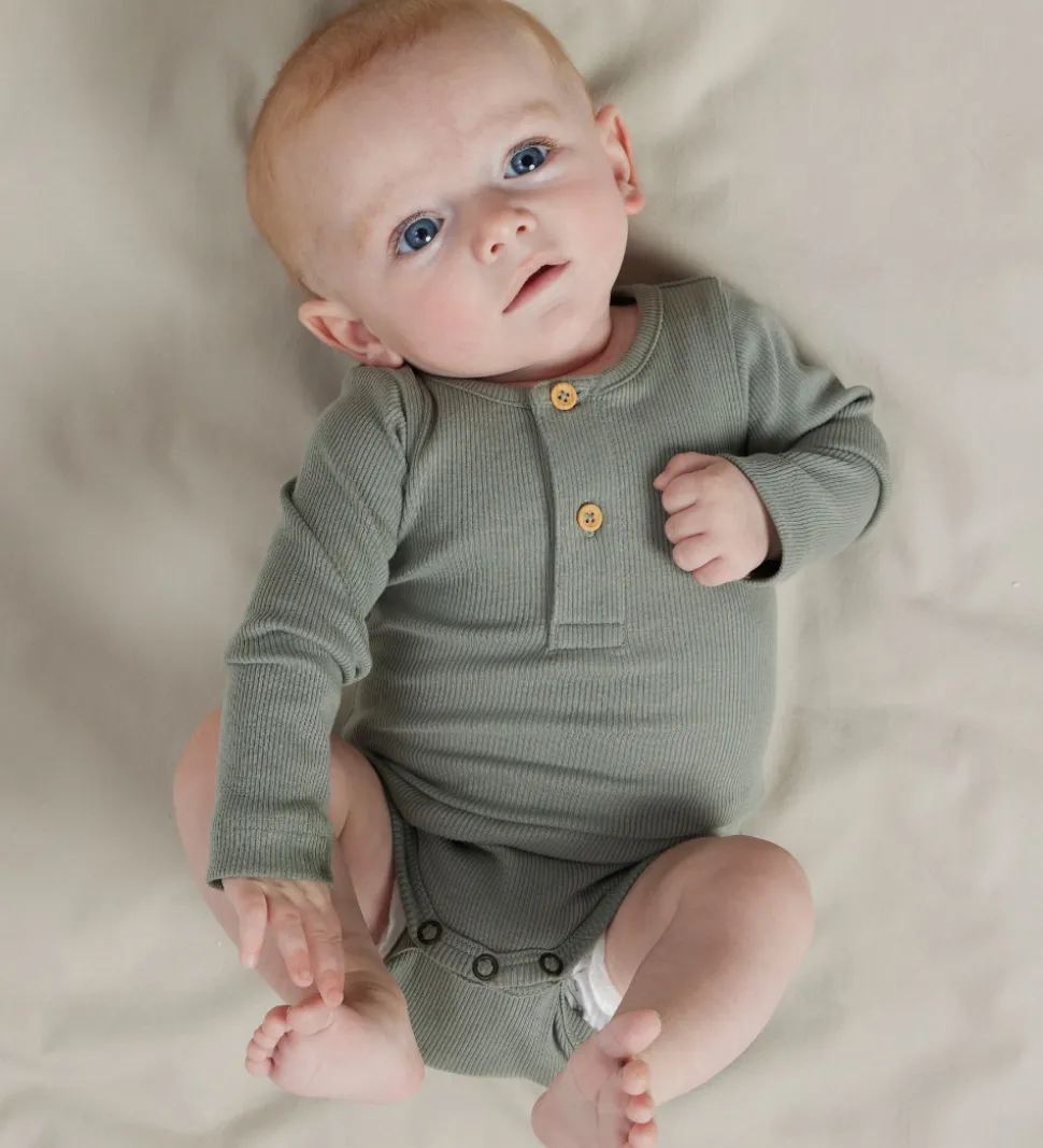 Smart Name It body i støvet grøn med ribstruktur. Bodyen har to knapper foran og lange ærmer. Den lukkes med trykknapper mellem benene.