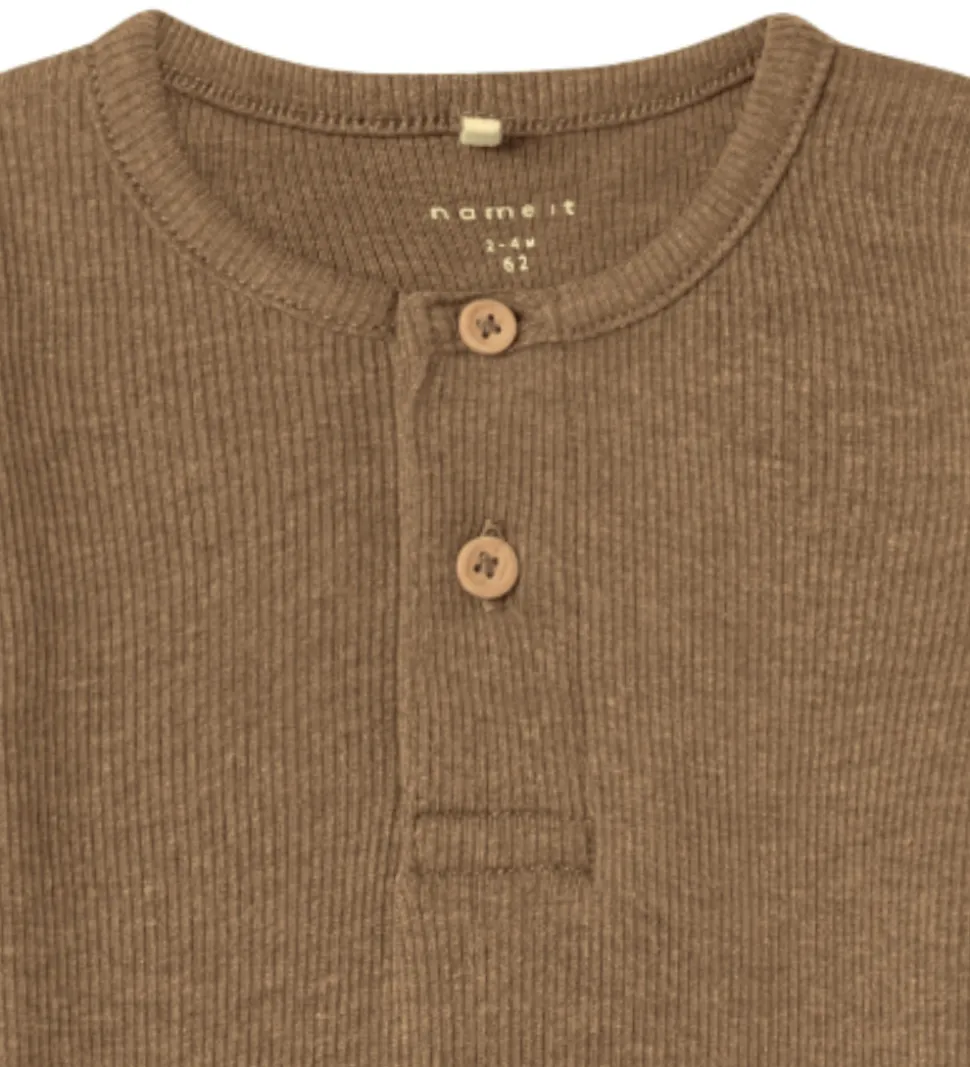 Flot Name It body i brun med ribstruktur. Bodyen har to knapper foran og lange ærmer. Den lukkes med trykknapper mellem benene.