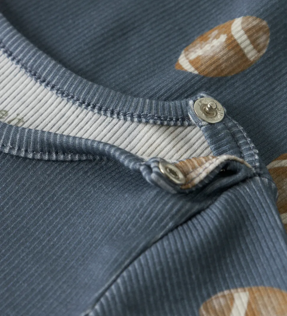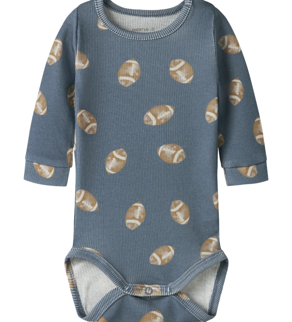 Flot Name It body i blå med et alloverprint af amerikanske fodbolde. Bodyen har diskret ribstruktur og lange ærmer. Den lukkes med trykknapper ved venstre skulder samt mellem benene.