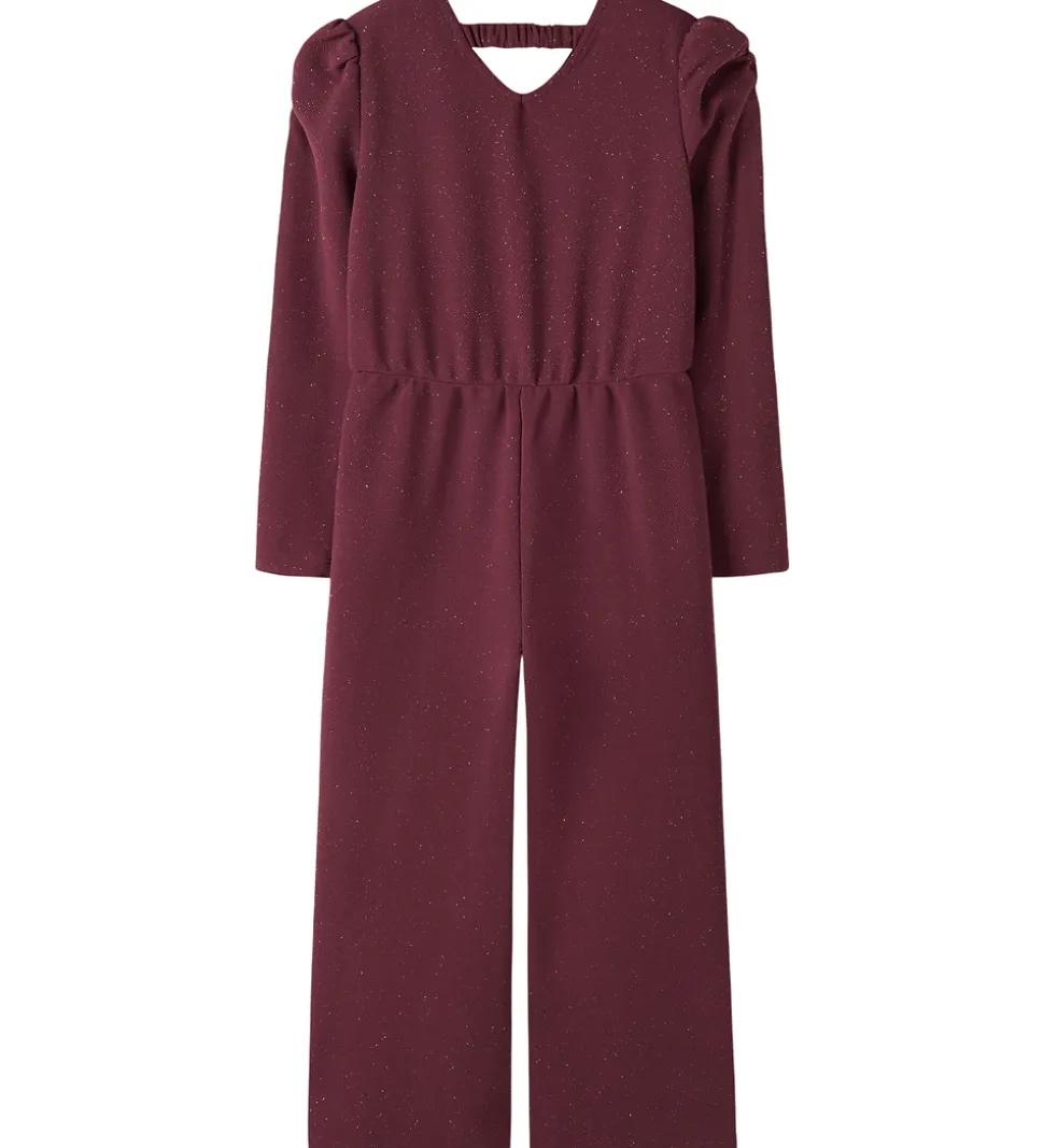 Elegant Name It buksedragt i bordeauxrød med glimmer. Name It buksedragten har lange ærmer og flotte pufdetaljer ved skuldrene. Foran ses en dekorativ slå-om-effekt, som sammen med den elastiske talje giver en god pasform. Øverst i halsen er der en lille trykknap, og i nakken er der en elastisk strop, som holder buksedragten på plads. Buksedragten har vidde i benene og er designet i et blødt materiale for en behagelig oplevelse.