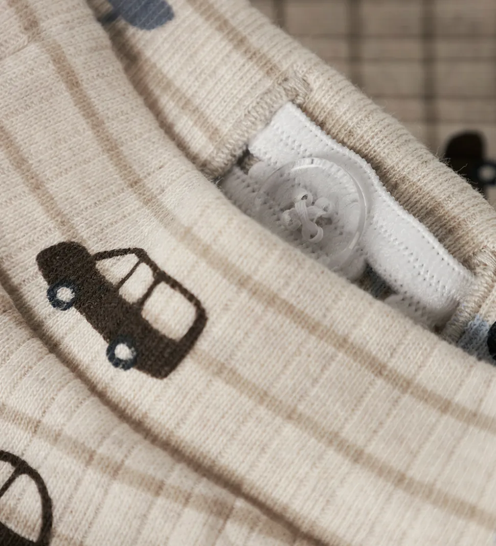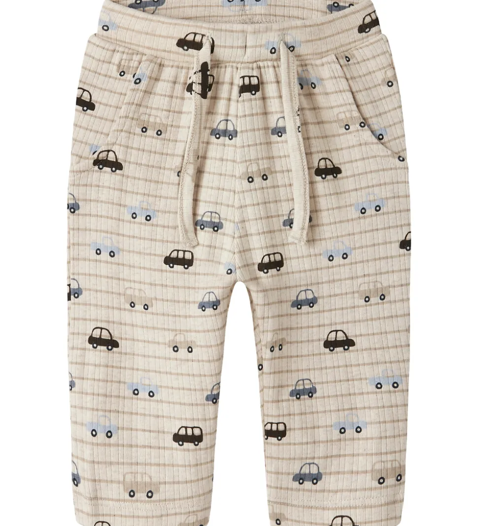 Flotte bukser fra Name It i meleret beige med et gennemgående bilprint i blå og brune nuancer. Name It bukserne har ribstruktur og en elastisk talje med indvendige knapper til justering samt dekorative snøre fortil. Bukserne har snydelommer i toppen foran.