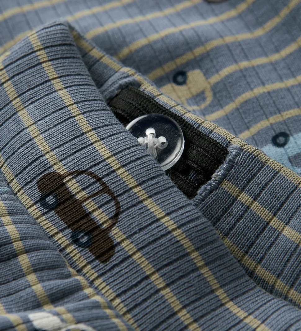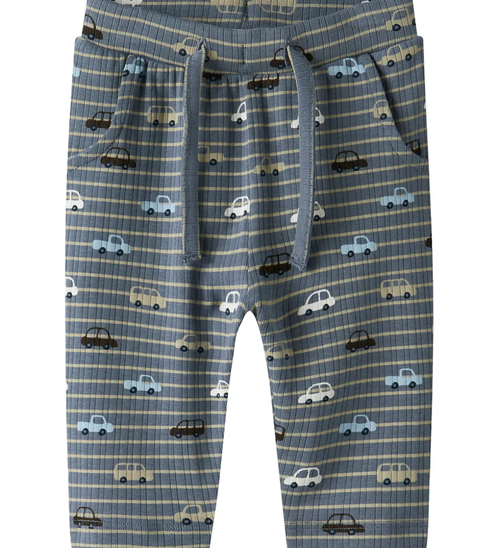 Fine bukser fra Name It i en flot blå nuance med et gennemgående bilprint i lyseblå, beige, brun og hvid. Name It bukserne har ribstruktur og en elastisk talje med indvendige knapper til justering samt dekorative snøre fortil. Bukserne har snydelommer i toppen foran.