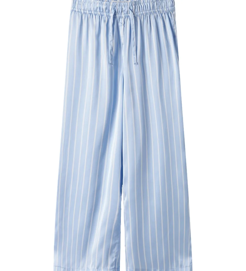 Flotte natbukser fra Name It i blå satin med hvide striber. Natbukserne har en elastisk talje, som kan justeres med knapper indvendigt. Fortil er der dekorative snører. Natbukserne har en afslappet og løs pasform.