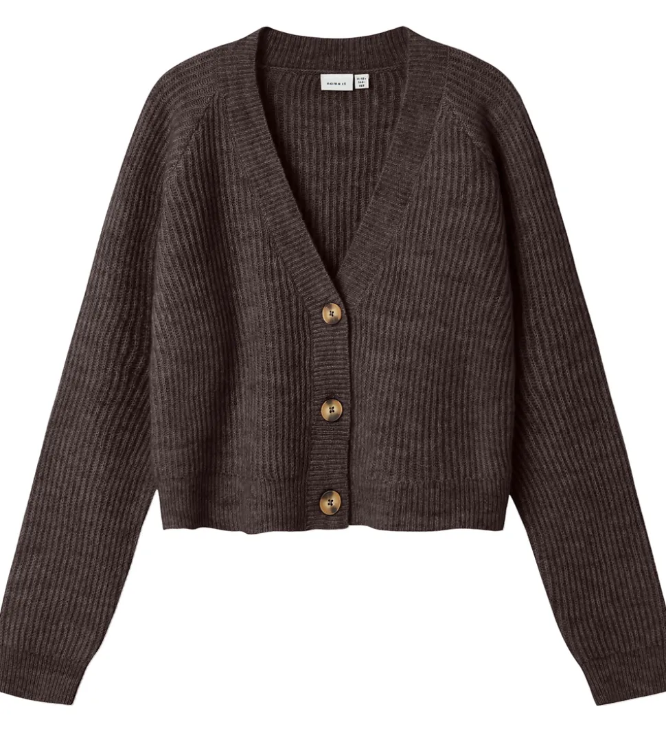 Stilren Name It cardigan i en klassisk, mørkebrun nuance med lange ærmer og en flot ribstrikketstruktur. Cardiganen fra Name It har en v-hals og knapper i en kontrastfyldt trælook, der fuldender designet.