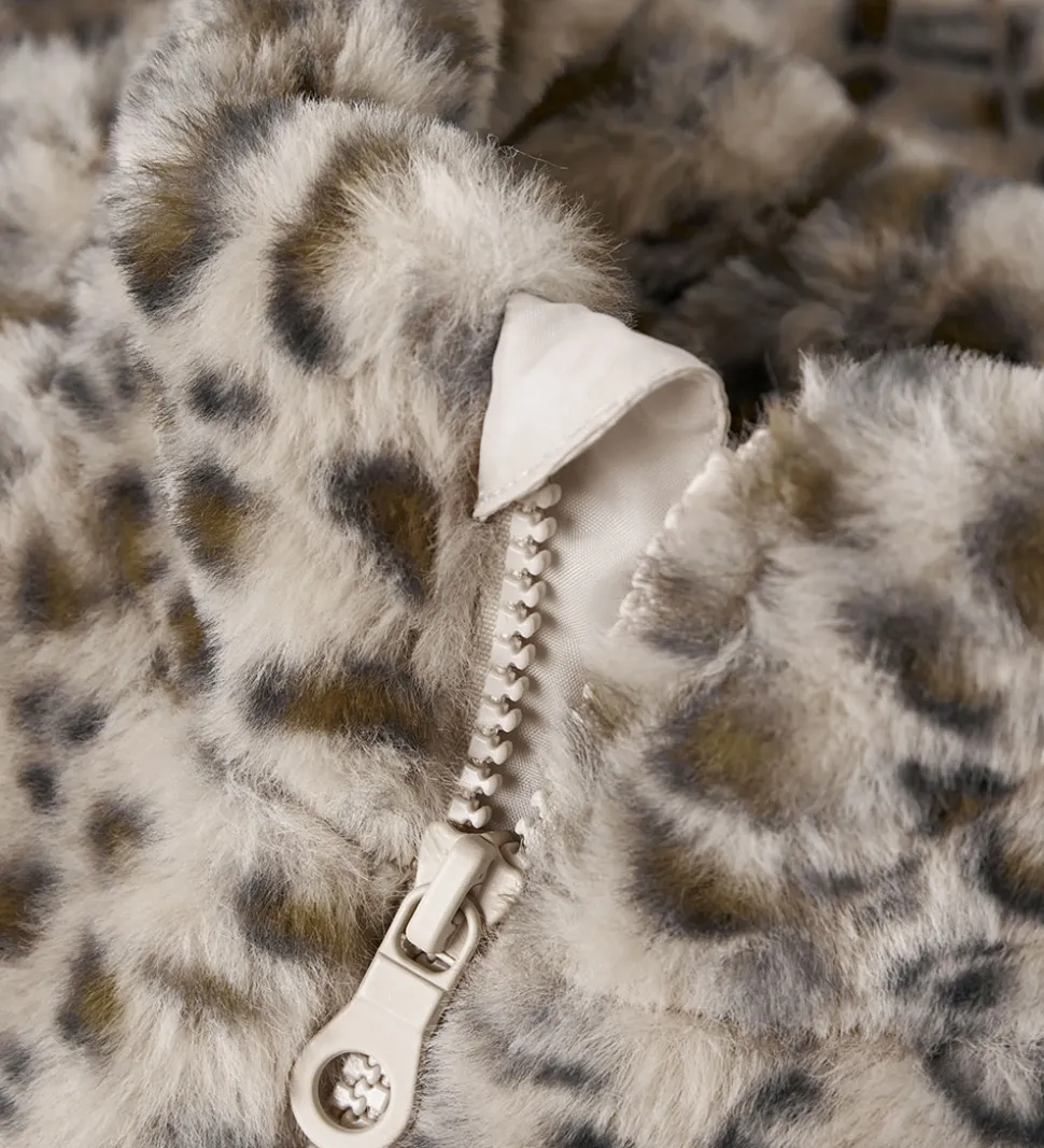 Blød Name It jakke af imiteret pels i et beige og brunt leopardmønster.