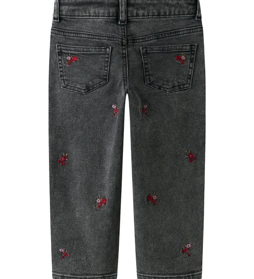 Charmerende Name It jeans i mørkegråt denim i en strækbar kvalitet og med smukke blomsterbroderier spredt over hele designet. Name It jeansene lukkes med en trykknap, og i livet har de en justerbar elastikkant. Både fortil og bagpå er der praktiske lommer.