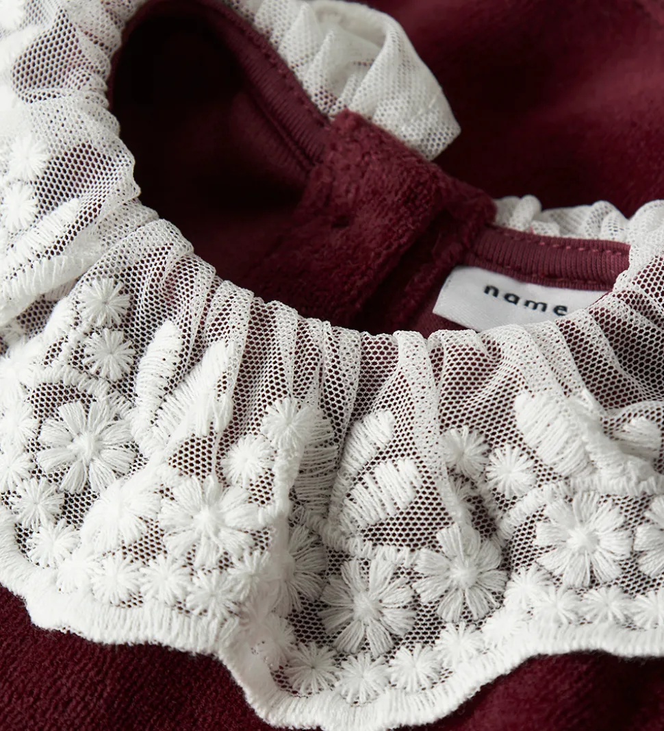 Elegant Name It kjole i mørkerødt velour med en hvid blondekrave i halsen. Kjolen har en rund halsudskæring med knapper i nakken. Den har lange ærmer med flæseafslutning ved håndleddene.